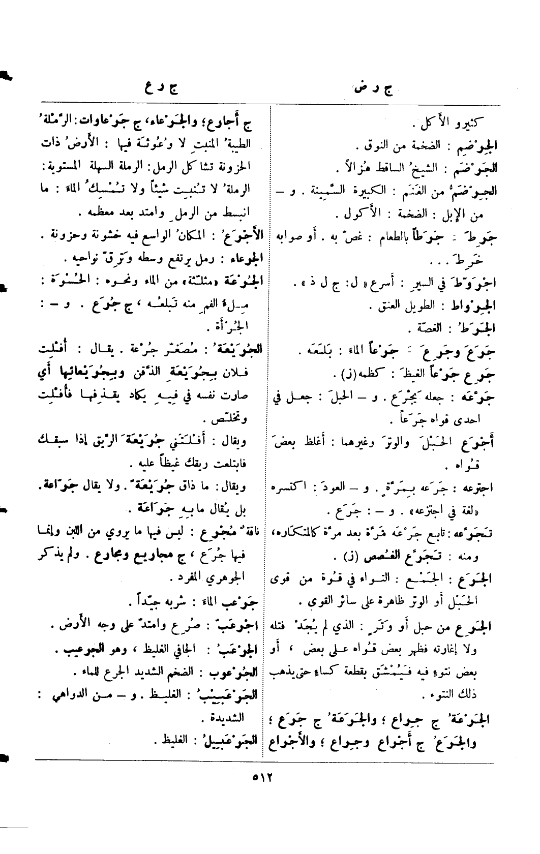 ج أجارع؛ والجرعاء، ج جرعاوات: الرملة الطيبة المنبت لا وعونة فيها: الأرض ذات الخزونة تشاكل الرمل: الرملة السهلة المستوية: الرملة لا تنبت شيئا ولا تمسك الماء: ما انبسط من الرمل وامتد بعد معظمه.