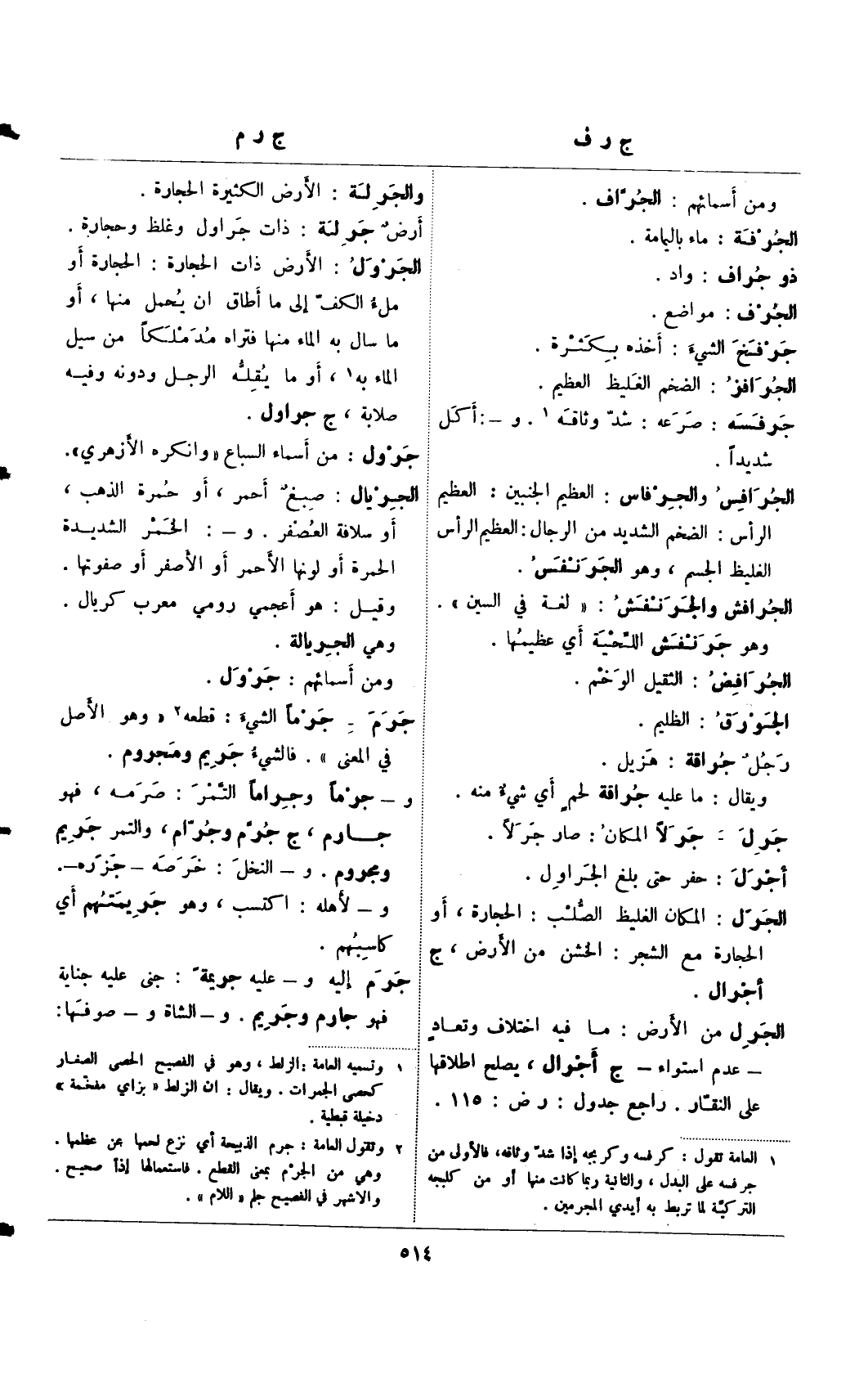 الجرول: الأرض ذات الحجارة: الحجارة أو ملء الكف إلى ما أطاق أن يحمل منها، أو ما سال به الماء منها فتراه مدملكا من سيل الماء به (¬2)، أو ما يقله الرجل ودونه وفيه صلابة، ج جراول.