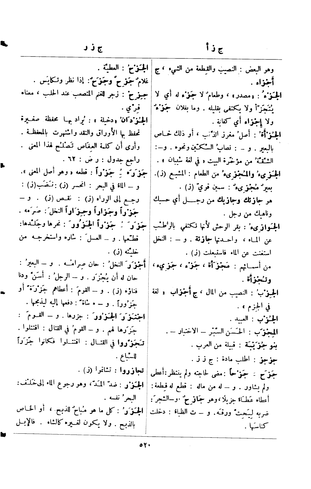 جزره جزرا: قطعة "وهو أصل المعنى". و- الماء في البحر: انحسر (ز): نضب (ز): رجع إلى الوراء (ز): نقص (ز). و- جزرا وجزارا وجزارا النخل: صرمه.