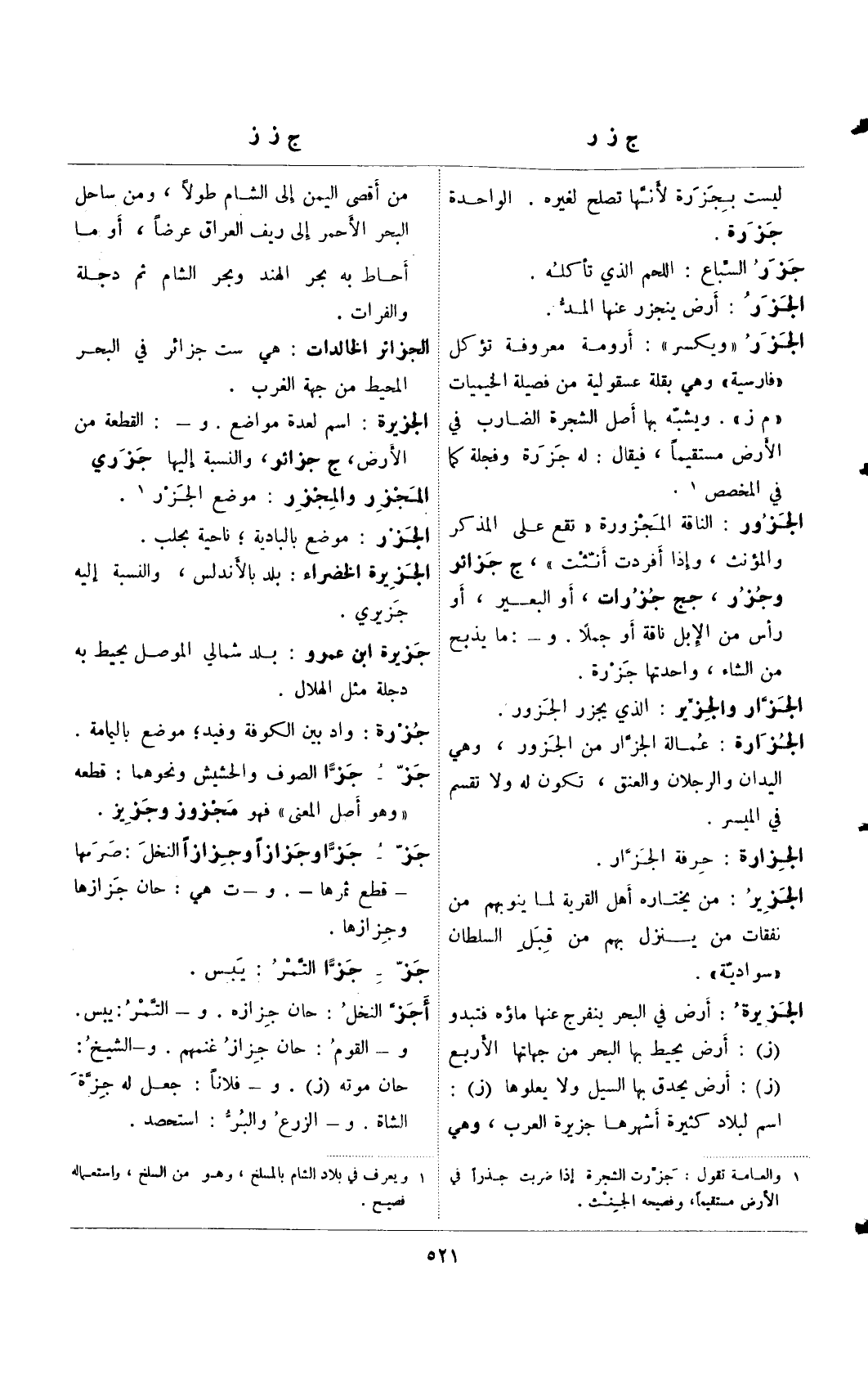 (ز): أرض يحيط بها البحر من جهاتها الأربع (ز) أرض يحدق بها السيل ولا يعلوها (ز): اسم لبلاد كثيرة أشهرها جزيرة العرب، وهي