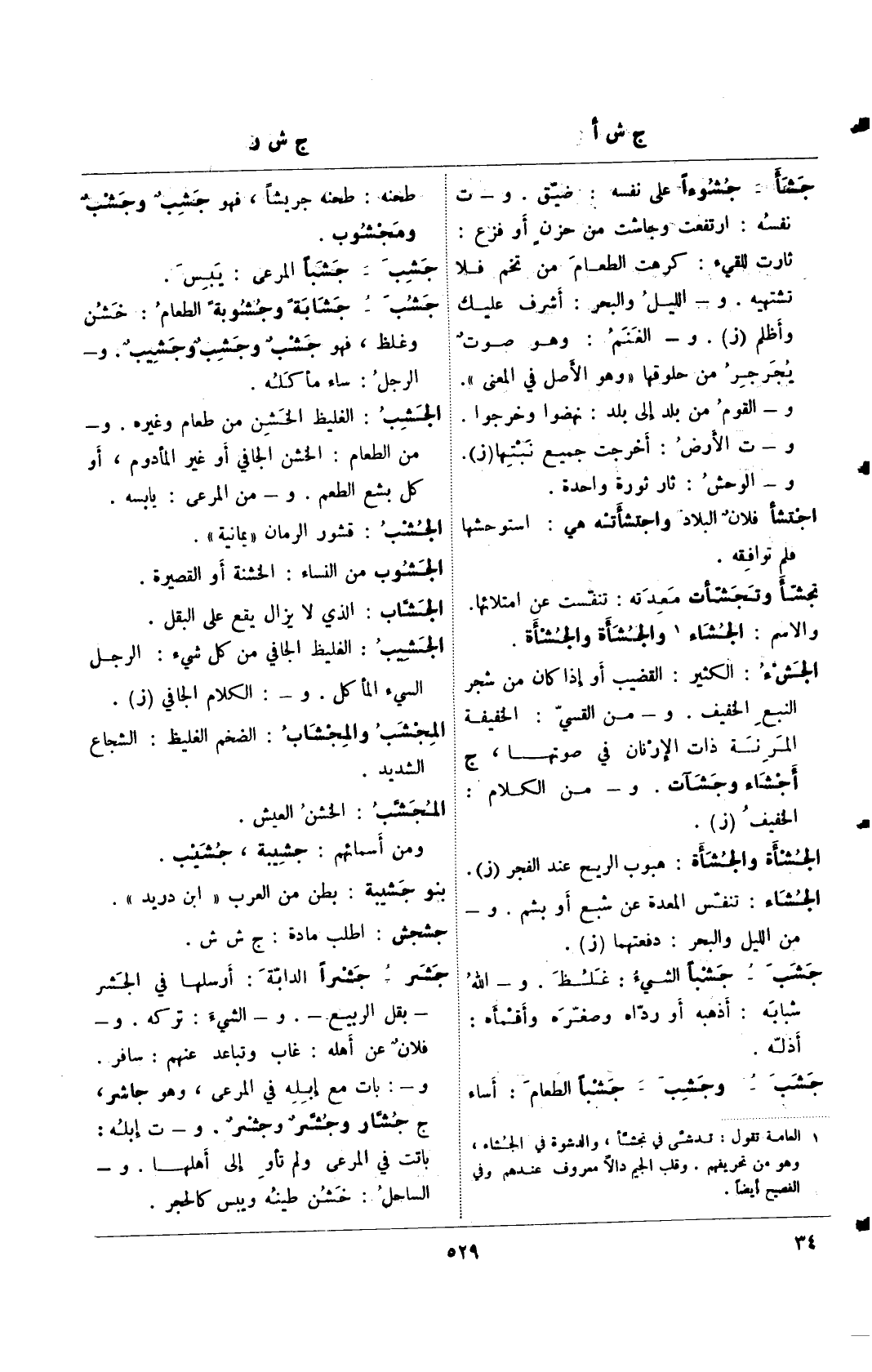 جشأ- جشوءًا على نفسه: ضيق. و- ت نفسه: ارتفعت وجاشت من حزنٍ أو فزع: ثارت للقيء: كرهت الطعام من تخم فلا تشتهيه. و- الليل والبحر: أشرف عليك وأظلم (ز). و- الغنم: وهو صوت يجرجر من حلوقها"وهو الأصل في المعنى". و- القوم من بلد إلى بلد: نهضوا وخرجوا. و- ت الأرض: أخرجت جميع نبتها (ز). و- الوحش: ثار ثورة واحدة.