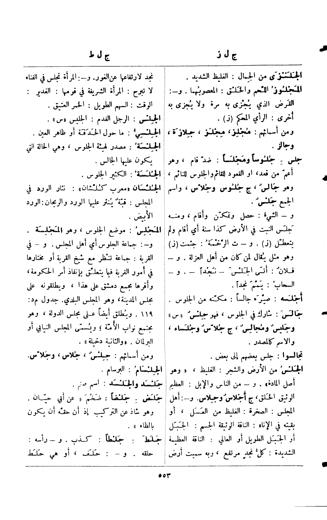 المجلس: موضع الجلوس، وهو المجلسة. و-: جماعة الجلوس أي أهل المجلس. و- في القرية: جماعة تنظر مع شيخ القرية أو مختارها في أمور القرية فيما يتعلق بإنفاذ أمر الحكومة، وأقرها مجمع دمشق على هذا، ويطلقونه على مجلس المدينة، وهو المجلس البلدي. جدول م د: 119. ويطلق أيضًا على مجلس الدولة، وهو مجتمع نواب الأمة؛ ويسمى المجلس النيابي أو البرلمان. "والثانية دخيلة".