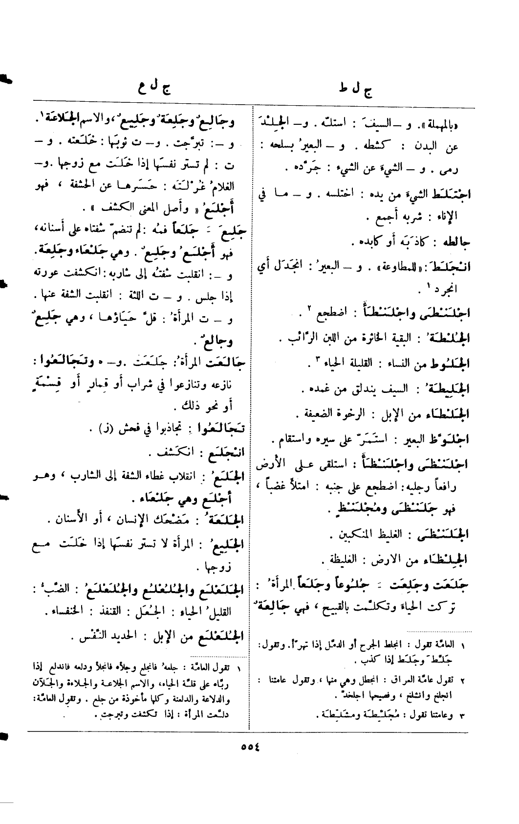 (¬4) تقول العامة: جلعه فانجلع وجلأه فانجلأ ودلعه فندلع إذا رباه على قلة الحياء، والاسم الجلاعة والجلاءة والجلان والدلاعة والدلعنة وكلها مأخذة من جلع. وتقول العامة: دلعت المرأة: إذا تكشفت وتبرجت.