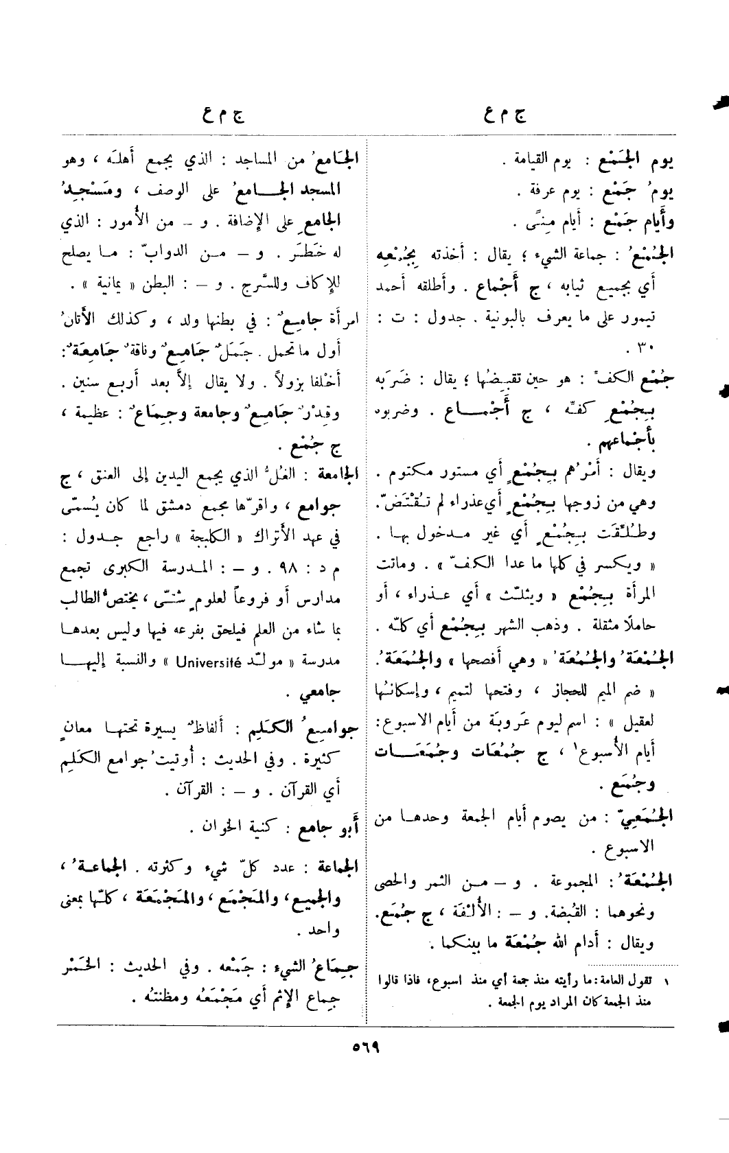 الجامعة: الغل الذي يجمع اليدين إلى العنق، ج جوامع، وأقرها مجمع دمشق لما كان يسمى في عهد الأتراك "الكلبجة" راجع جدول: م د: 98. و-: المدرسة الكبرى تجمع مدارس أو فروعًا لعلوم شتى، يختص الطالب بما شاء من العلم فيلحق بفرعه فيها وليس بعدها مدرسة "مولد Universite" والنسبة إليها جامعي.
