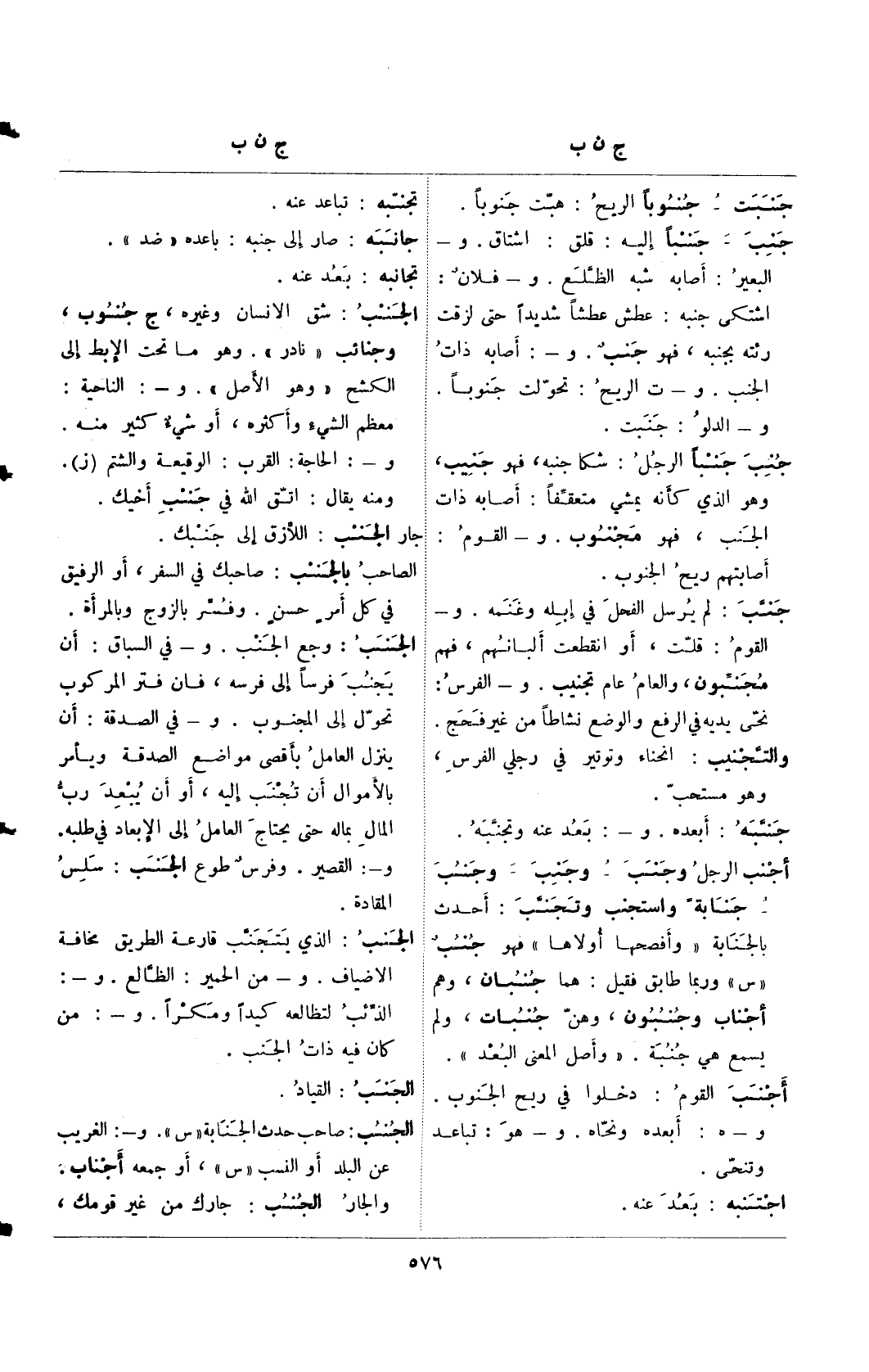 أجنب الرجل وجنب- وجيب- وجنب – جنابة واستجنب وتجنب: أحدث بالجنابة "وأفصحها أولاها" فهو جنب "س" وربما طابق فقيل: هما جنبان، وهم أجناب وجنبون، وهن جنبات، ولم يسمع هي جنبة. "وأصل المعنى البعد".