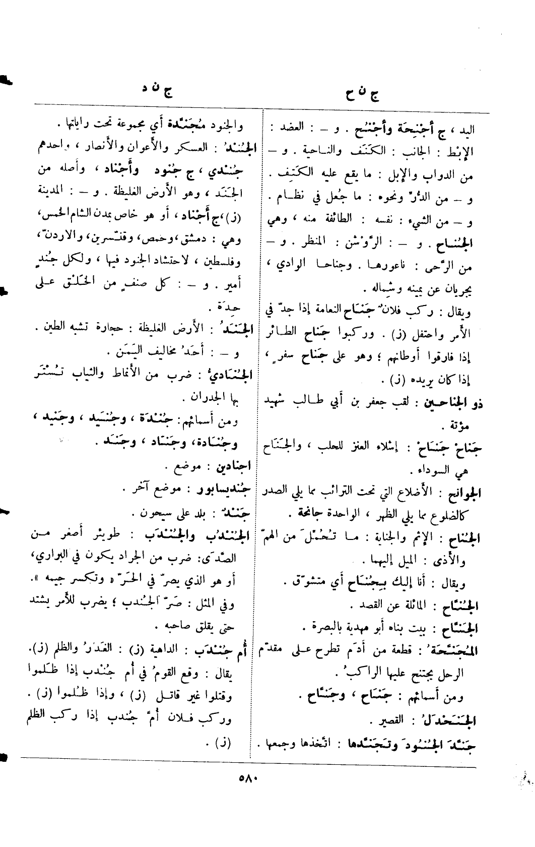 الجند: العسكر والأعوان والأنصار، واحدهم جندي، ج جنود وأجناد، وأصله من الجند، وهو الأرض الغليظة. و-: المدينة (ز)، ج أجناد، أو هو خاص بمدن الشام الخمس، وهي: دمشق، وحمص، وقنسرين، والأردن، وفلسطين، لاحتشاد الجنود فيها، ولكل جند أمير. و-: كل صنف من الخلق على حدة.