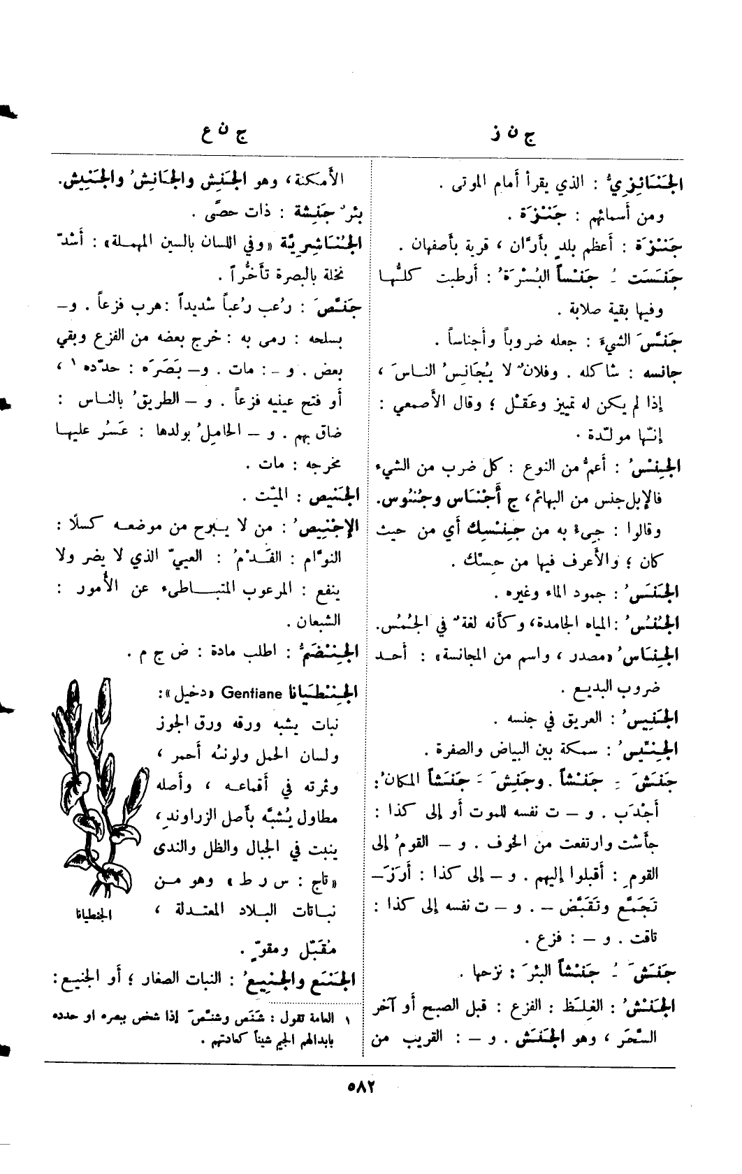 الجنطيانا Gentiane " دخيل": نبات يشبه ورقه ورق الجوز ولسان الحمل ولونه أحمر، وثمرته في أقماعه، وأصله مطاول يشبه بأصل الزراوند، ينبت في الجبال والظل والندى "تاج: س ر ط" وهو من نباتات البلاد المعتدلة، مقبل ومقو.