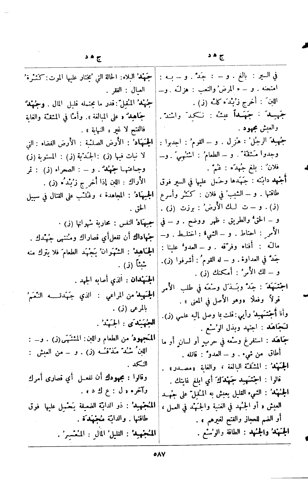 الجهاد: الأرض الصلبة: الأرض الفضاء: التي لا نبات فيها (ز): الجدبة (ز): المستوية (ز) وجماعتها جهد. و-: الصحراء (ز): ثمر الأراك: اللبن إذا أخرج زبده (ز).