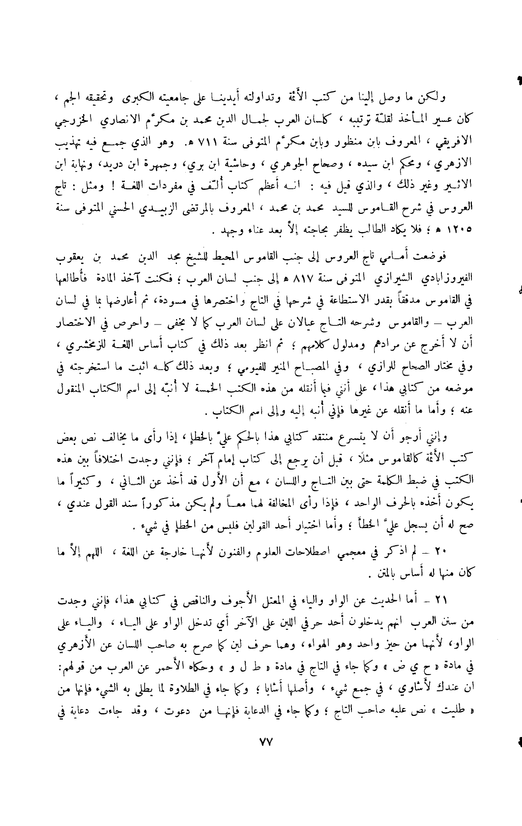 وإنني أرجو أن لا يتسرع منتقد كتابي هذا بالحكم علي بالخطأ، إذا رأى ما يخالف نص بعض كتب الأئمة كالقاموس مثلًا، قبل أن يرجع إلى كتاب إمام آخر؛ فإنني وجدت اختلافًا بين هذه الكتب في ضبط الكلمة حتى بين التاج واللسان، مع أن الأول قد أخذ عن الثاني، وكثيرًا ما يكون أخذه بالحرف الواحد، فإذا رأى المخالفة لهما معًا ولم يكن مذكورًا سند القول عندي، صح له أن يسجل على الخطأ، وأما اختيار أحد القولين فليس من الخطأ في شيء.