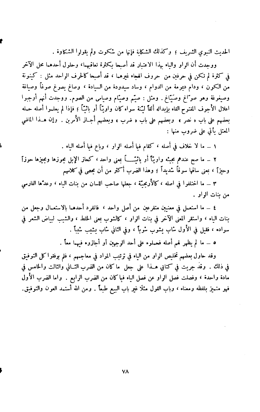 وقد حاول بعضهم تخليص الواو من الياء في ترتيب المواد في معاجمهم، فلم يوفقوا كل التوفيق في ذلك. وقد جريت في كتابي هذا على جعل ما كان من الضرب الثاني والثالث والخامس في مادة واحدة، وفصلت فصل الواو عن فصل الياء فيما كان من الضرب الرابع. وأما الضرب الأول فهو متميز بلفظه ومعناه، وباب القول مثلًا غير باب البيع طبعًا. ومن اله أستمد العون والتوفيق.