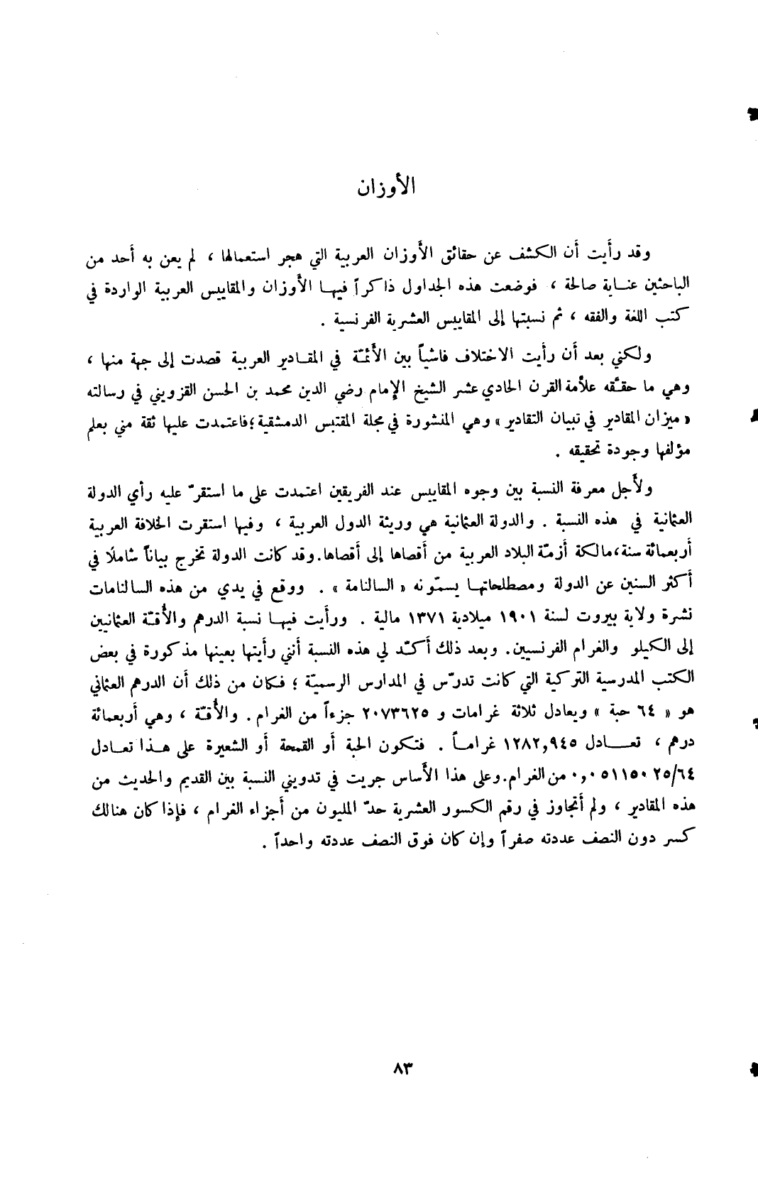 وقد رأيت أن الكشف عن حقائق الأوزان العربية التي هجر استعمالها، لم يعن به أحد من الباحثين عناية صالحة، فوضعت هذه الجداول ذاكرًا فيها الأوزان والمقاييس العربية الواردة في كتب اللغة والفقه، ثم نسبتها إلى المقاييس العشرية الفرنسية.