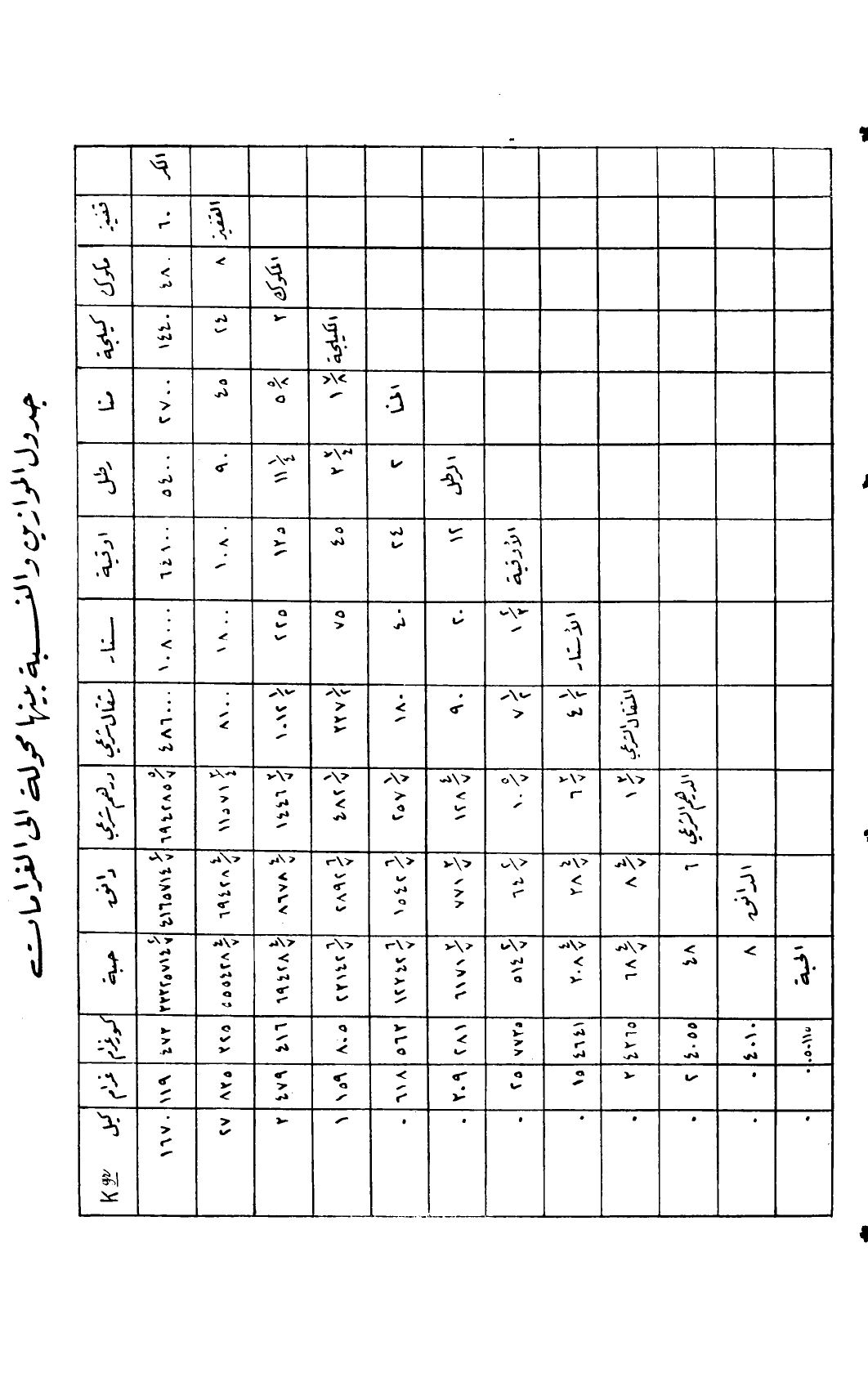 جدول الموازين والنسبة بينها محولة إلى الغرامات