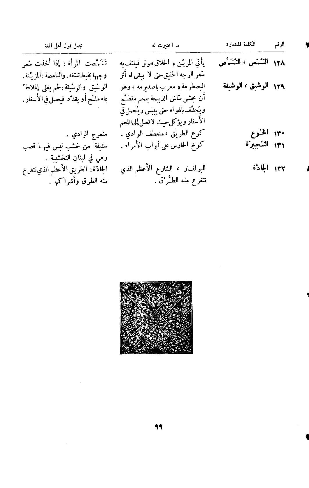 128 ... النمص، التنمص ... يأتي المزين "الحلاق" بوتر فينتف به سعر الوجه الحليق حتى لا يبقى له أثر ... تنمصت المرأة: إذا أخذت شعر وجهها بخيط تنتفه. والنامصة: المزينة.