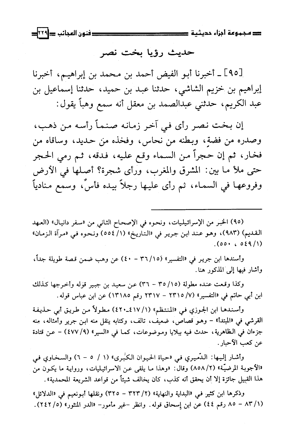 [95] أَخْبَرَنَا أَبُو الْفَيْضِ أَحْمَدُ بْنُ مُحَمَّدِ بْنِ إِبْرَاهِيمَ ، أَخْبَرَنَا إِبْرَاهِيمُ بْنُ خُزَيْمٍ الشَّاشِيُّ ، حَدَّثَنَا عَبْدُ بْنُ حُمَيْدٍ ، حَدَّثَنَا إِسْمَاعِيلُ بْنُ عَبْدِ الْكَرِيمِ ، حَدَّثَنِي عَبْدُ الصَّمَدِ بْنُ مَعْقِلٍ ، أَنَّهُ سَمِعَ وَهْبًا ، يَقُولُ : " إِنَّ بُخْتَ نَصْرٍ رَأَى فِي آخِرِ زَمَانِهِ صَنَمًا , رَأْسُهُ مِنْ ذَهَبٍ ، وَصَدْرُهُ مِنْ فِضَّةٍ ، وَبَطْنُهُ مِنْ نُحَاسٍ ، وَفَخِذُهُ مِنْ حَدِيدٍ ، وَسَاقَاهُ مِنْ فَخَّارٍ ، ثُمَّ إِنَّ حَجَرًا مِنَ السَّمَاءِ وَقَعَ عَلَيْهِ ، فَدَقَّهُ ، ثُمَّ رَمَى الْحَجَرَ حَتَّى مَلَأَ مَا بَيْنَ الْمَشْرِقِ وَالْمَغْرِبِ ، وَرَأَى شَجَرَةً , أَصْلُهَا فِي الْأَرْضِ ، وَفُرُوعُهَا فِي السَّمَاءِ , ثُمَّ رَأَى عَلَيْهَا رَجُلًا بِيَدِهِ فَأْسٌ ، وَسَمِعَ مُنَادِيًا يُنَادِي ، فَقَالَ : اضْرِبْ جِذْعَهَا ، فَتَفَرَّقَ الطَّيْرُ مِنْ فَرْعِهَا ، وَتَفَرَّقَ السِّبَاعُ وَالدَّوَابُّ مِنْ تَحْتِهَا ، وَاتْرُكْ أَصْلَهَا قَائِمًا ، فَعَبَّرَهُ لَهُ دَانِيَالُ قَالَ : أَمَّا الصَّنَمُ الَّذِي رَأَيْتَ ، فَأُمَمٌ مُخْتَلِفَةٌ فِي أَوَّلِ الزَّمَانِ ، وَفِي أَوْسَطِهِ ، وَفِي أَخِرِهِ ، فَأَنْتَ الرَّأْسُ مِنَ الذَّهَبِ ، وَأَنْتَ أَفْضَلُ مِنْ فِضَّةٍ ، فَابْنُكَ يَمْلِكُ مِنْ بَعْدَكَ ، وَأَمَّا الْبَطْنُ الَّذِي رَأَيْتَ مِنَ نُحَاسٍ ، فَمَلِكٌ يَكُونُ بَعْدَ ابْنِكَ ، وَأَمَّا مَا رَأَيْتَ مِنَ الْفَخِذِ مِنَ الْحَدِيدِ ، فَمُتَفَرِّقٌ فَرِيقَيْنِ فِي فَارِسَ ، يَكُونُ أَشَدُّ الْمَلِكِ ، وَأَمَّا الْفَخَّارُ فَآخِرُ مَلِكِهِمْ يَكُونُ دُونَ الْحَدِيدِ ، وَأَمَّا الْحَجَرُ الَّذِي رَأَيْتَ دَقَّهُ ، وَرَبُوهُ حَتَّى مَلَأَ مَا بَيْنَ الْمَشْرِقِ وَالْمَغْرِبِ ، فَحَذَفَ اللَّهُ بِهِ هَذِهِ الْأُمَمَ فِي آخِرِ الزَّمَانِ ، فَيَظْهَرُ عَلَيْهَا حَتَّى يُبْعَثَ نَبِيُّ أُمِّيُّ مِنَ الْعَرَبِ ، فَيَدُقُّ بِهِ الْأُمَمَ كَمَا رَأَيْتَ الْحَجَرَ دَقَّ أَصْنَافَ الصَّنَمِ ، وَيُظْهِرُهُ عَلَى الْأَدْيَانِ وَالْأُمَمِ كَمَا رَأَيْتَ الْحَجَرَ ظَهْرَ عَلَى الْأَرْضِ ، وَانْتَشَرَ فِيهَا حَتَّى مَلَأَهَا ، فَيَحِقُّ اللَّهُ بِهِ الْحَقَّ ، وَيُزْهِقُ بِهِ الْبَاطِلَ ، وَيَعِزُّ بِهِ الْأَذِلَّةَ ، وَيَنْصُرُ بِهِ الْمُسْتَضْعَفِينَ ، وَأَمَّا الشَّجَرَةُ الَّتِي رَأَيْتَ ، وَالطَّيْرُ الَّتِي عَلَيْهَا ، وَالسِّبَاعُ وَالدَّوَابُّ الَّتِي تَحْتَهَا ، وَمَا أَمَرَ بِقَطْعِهَا ، فَيَذْهَبُ مُلْكُكَ ، فَيَرُدُّكَ اللَّهُ طَائِرًا يَكُونُ نِسْرًا مَلَكَ الطَّائِرَ ، ثُمَّ يَرُدُّكَ اللَّهُ ثَوْرًا مَلَكَ الدَّوَابَّ ، ثُمَّ يَرُدُّكَ اللَّهُ أَسَدًا مَلَكَ السِّبَاعَ وَالْوَحْشَ ، كَانَ مَسْخُهُ كُلَّ سَبْعِ سِنِينَ فِي ذَلِكَ , قَلْبُكَ قَلْبُ إِنْسَانٍ ، حَتَّى تَعْلَمَ أَنَّ اللَّهَ لَهُ مُلْكُ السَّمَوَاتِ وَالْأَرْضِ ، وَهُوَ يَقْدِرُ عَلَى الْأَرْضِ وَمَنْ عَلَيْهَا ، وَكَمَا رَأَيْتَ أَصْلَهَا قَائِمًا ، فَإِنَّ مُلْكَكَ قَائِمٌ . فَمُسِخَ بُخْتُ نَصْرٍ نِسْرًا فِي الطَّيْرِ ، وَثَوْرًا فِي الدَّوَابِّ ، وَأَسَدًا فِي السِّبَاعِ ، ثُمَّ رَدَّ اللَّهُ إِلَيْهِ مُلْكَهُ ، فَآمَنَ ، وَدَعَا النَّاسَ إِلَى اللَّهِ عَزَّ وَجَلَّ . فَسُئِلَ وَهْبٌ : أَكَانَ مُؤْمِنًا ؟ فَقَالَ : وَجَدْتُ أَهْلَ الْكِتَابِ قَدِ اخْتَلَفُوا : فَمِنْهُمْ مَنْ قَالَ : مُؤْمِنًا ، وَمِنْهُمْ مَنْ قَالَ : أَحْرَقَ بَيْتَ اللَّهِ وَكُتُبَهُ ، وَقَتَلَ الْأَنْبِيَاءَ ، وَغَضِبَ اللَّهُ عَلَيْهِ غَضَبًا ، فَلَمْ يَقْبَلْ مِنْهُ حِينَئِذٍ تَوْبَةً " *