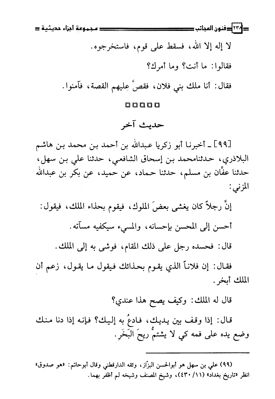 [99 ] أَخْبَرَنَا أَبُو زَكَرِيَّا عَبْدُ اللَّهِ بْنُ أَحْمَدَ بْنِ مُحَمَّدِ بْنِ هَاشِمٍ الْبَلَاذُرِيُّ ، حَدَّثَنَا مُحَمَّدُ بْنُ إِسْحَاقَ الشَّافِعِيُّ ، حَدَّثَنَا عَلِيُّ بْنُ سَهْلٍ ، حَدَّثَنَا عَفَّانُ بْنُ مُسْلِمٍ ، حَدَّثَنَا حَمَّادٌ ، عَنْ حُمَيْدٍ ، عَنْ بَكْرِ بْنِ عَبْدِ اللَّهِ الْمُزَنِيِّ ، " أَنَّ رَجُلًا يَغْشَى بَعْضَ الْمُلُوكِ ، فَيَقُومُ بِحِذَاءِ الْمَلِكِ ، فَيَقُولُ : أَحْسِنْ إِلَى الْمُحْسِنِ بِإِحْسَانِهِ ، وَالْمُسِيءُ سَيَكْفِيهِ مَسْآتُهُ . قَالَ : فَحَسَدَهُ رَجُلٌ عَلَى ذَلِكَ الْمَقَامِ , فَوَشَى بِهِ إِلَى الْمَلِكِ ، فَقَالَ : إِنَّ فُلَانًا الَّذِي يَقُومُ بِحِذَائِكَ ، فَيَقُولُ مَا يَقُولُ ، زَعَمَ أَنَّ الْمَلِكَ أَبْخَرُ , قَالَ لَهُ الْمَلِكُ : وَكَيْفَ يَصِحُّ هَذَا عِنْدِي ؟ قَالَ : إِذَا وَقَفَ بَيْنَ يَدَيْكَ ، فَادْعُ بِهِ إِلَيْكَ ؟ فَإِنَّهُ إِذَا دَنَا مِنْكَ وَضَعَ يَدَهُ عَلَى فَمِهِ كَيْ لَا يَشُمَّ رِيحَ الْبَخَرِ , قَالَ لَهُ : انْصَرِفْ حَتَّى أَنْظُرَ . قَالَ : فَخَرَجَ ، فَدَعَا الرَّجُلُ إِلَى مَنْزِلِهِ ، فَأَطْعَمَهُ طَعَامًا فِيهِ ثُومٌ ، ثُمَّ خَرَجَ مِنْ عِنْدِهِ ، فَجَاءَ إِلَى الْمَلِكِ ، فَقَامَ بِحِذَائِهِ ، فَقَالَ : أَحْسِنْ إِلَى الْمُحْسِنِ بِإِحْسَانِهِ ، وَالْمُسِيءُ سَيَكْفِيهِ مَسَاوِئه ، فَقَالَ الْمَلِكُ فِي نَفْسِهِ : مَا أَرَى فُلَانًا إِلَّا قَدْ صَدَقَنِي . وَكَانَ مَعْرُوفًا أَنَّهُ لَا يَكْتُبُ بِخَطِّهِ لِأَحَدٍ إِلَّا بِجَائِزَةٍ أَوْ صِلَةٍ أَوْ مَعْرُوفٍ ، فَكَتَبَ لَهُ بِخَطِّهِ إِلَى عَامَلٍ مِنْ عُمَّالِهِ : إِذَا أَتَاكَ صَاحِبُ كِتَابِي هَذَا ، فَاذْبَحْهُ ، وَاسْلُخْهُ ، وَاحْشِ جِلْدَهُ تِبْنًا ، وَابْعَثْ بِهِ إِلَيَّ . قَالَ : فَخَرَجُ وَالْكِتَابُ مَعَهُ ، فَلَقِيَهُ الَّذِي سَعَى بِهِ ، فَقَالَ : مَا هَذَا الْكِتَابُ ؟ قَالَ : كِتَابٌ كَتَبَهُ لِيَ الْمَلِكُ بِخَطِّهِ ، فَقَالَ : احْبُونِي بِهِ ، هِبْهُ لِي . قَالَ : فَدَفَعَ الْكِتَابَ إِلَيْهِ ، فَمَضَى الرَّجُلُ إِلَى الْعَامِلِ ، فَلَمَّا قَرَأَ الْكِتَابَ قَالَ : أَتَدْرِي مَا فِيهِ ؟ قَالَ : كِتَابُ خَطِّ الْمَلِكِ بِالْحَبَايِرِ وَالصِّلَةِ , قَالَ : إِنَّ فِي كِتَابِكَ يَأْمُرُنِي أَنْ أَذْبَحَكَ ، وَأَسْلُخَكَ ، وَأَحْشُوَ جِلْدَكَ تِبْنًا ، وَأَبْعَثَ بِكَ إِلَيْهِ قَالَ : اللَّهُ ، اللَّهُ ، لَيْسَ هَذَا الْكِتَابُ لِي ، إِنَّمَا كَتَبَهُ لِغَيْرِي ، رَاجِعْ إِلَى الْمَلِكِ فِيَّ , قَالَ : لَيْسَ لِكِتَابِ الْمَلِكِ مُرَاجَعَةٌ . قَالَ : فَذَبَحَهُ ، وَسَلَخَهُ ، وَحَشَاهُ تِبْنًا ، وَبَعَثَ بِهِ إِلَى الْمَلِكِ ، وَجَاءَ الرَّجُلُ ، فَقَامَ بِحِذَاءِ الْمَلِكِ ، فَقَالَ : أَحْسِنْ إِلَى الْمُحْسِنِ بِإِحْسَانِهِ ، وَالْمُسِيءُ سَيَكْفِيكَ مَسَاوِئهُ , قَالَ لَهُ الْمَلِكُ : مَا فَعَلْتَ بِالْكِتَابِ الَّذِي كَتَبْتُهُ لَكَ ؟ قَالَ : لَقِيَنِي فُلَانٌ ، فَاسْتَوْهَبَنِي ، فَوَهَبْتُهُ لَهُ , قَالَ : إِنَّ فُلَانًا ذَكَرَ أَنَّكَ تَزْعُمُ أَنِّي أَبْخَرُ ؟ قَالَ : مَعَاذَ اللَّهِ ، مَا قُلْتُ هَذَا أَيُّهَا الْمَلِكُ , قَالَ : فَلِمَ وَضَعْتَ يَدَكَ عَلَى فِيكَ حِينَ قَرُبْتَ مِنِّي ؟ قَالَ : أَطْعَمَنِي طَعَامًا فِيهِ ثُومٌ ، فَوَضَعْتُ يَدِي عَلَى فِي ، كَيْ لَا تَشُمَّ مِنِّي رِيحَ الثُّومِ , قَالَ : صَدَقْتَ ، قُمْ ذَلِكَ الْمَكَانَ ، وَقُلْ كَمَا كُنْتَ تَقُولُ " *
