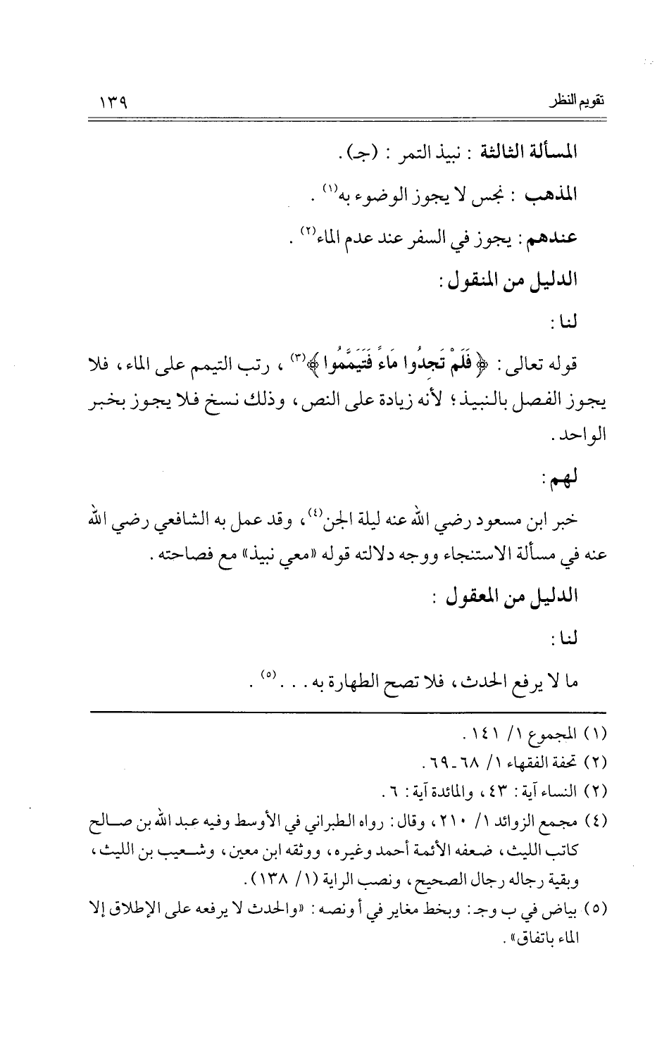 قَوْله تَعَالَى: {فَلم تَجدوا مَاء فَتَيَمَّمُوا} ، رتب التَّيَمُّم على المَاء، فَلَا يجوز الْفَصْل بالنبيذ؛ لِأَنَّهُ زِيَادَة على النَّص، وَذَلِكَ نسخ فَلَا يجوز بِخَبَر الْوَاحِد.