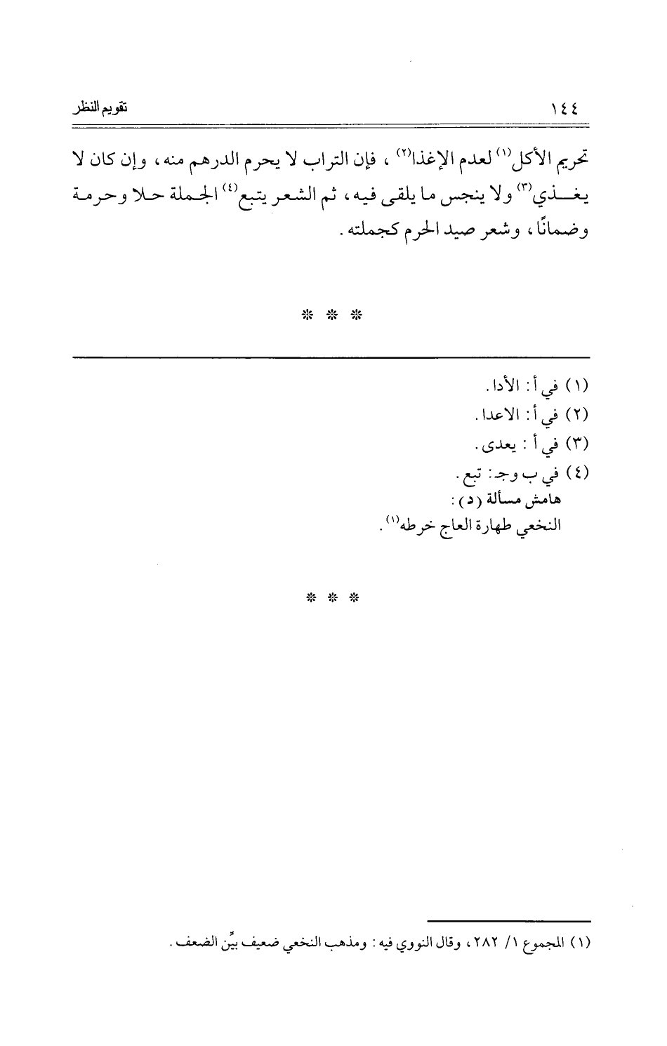 تَحْرِيم الْأكل لعدم الإغذا، فَإِن التُّرَاب لَا يحرم الدِّرْهَم مِنْهُ، وَإِن كَانَ لَا يغذي وَلَا ينجس مَا يلقى فِيهِ، ثمَّ الشّعْر يتبع الْجُمْلَة حلا وَحُرْمَة وضمانا، وَشعر صيد الْحرم كجملته.