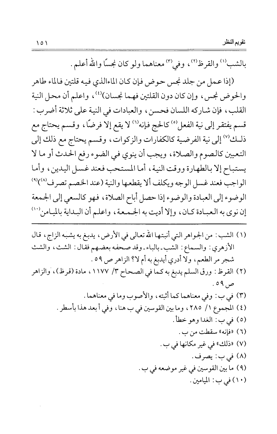 (إِذا عمل من جلد نجس حَوْض فَإِن كَانَ المَاء الَّذِي فِيهِ قُلَّتَيْنِ فالماء طَاهِر والحوض نجس، وَإِن كَانَ دون الْقلَّتَيْنِ فهما نجسان) ، وَاعْلَم أَن مَحل النِّيَّة الْقلب، فَإِن شَاركهُ اللِّسَان فَحسن، والعبادات فِي النِّيَّة على ثَلَاثَة أضْرب: قسم يفْتَقر إِلَى نِيَّة الْفِعْل كَالْحَجِّ فَإِنَّهُ لَا يَقع إِلَّا فرضا، وَقسم يحْتَاج مَعَ ذَلِك إِلَى نِيَّة الْفَرْضِيَّة كالكفارات والزكوات، وَقسم يحْتَاج مَعَ ذَلِك إِلَى التَّعْيِين كَالصَّوْمِ وَالصَّلَاة، وَيجب أَن يَنْوِي فِي الْوضُوء رفع الْحَدث أَو مَا لَا يستباح إِلَّا بِالطَّهَارَةِ وَوقت النِّيَّة، أما الْمُسْتَحبّ فَعِنْدَ غسل الْيَدَيْنِ، وَأما الْوَاجِب فَعِنْدَ غسل الْوَجْه ويكلف أَلا يقطعهَا وَالنِّيَّة (عِنْد الْخصم تصرف) الْوضُوء إِلَى الْعِبَادَة وَالْوُضُوء إِذا حصل أَبَاحَ الصَّلَاة، فَهُوَ كالسعي إِلَى الْجُمُعَة إِن نوى بِهِ الْعِبَادَة كَانَ، وَإِلَّا أدّيت بِهِ الْجُمُعَة، وَاعْلَم أَن الْبِدَايَة بالميامن