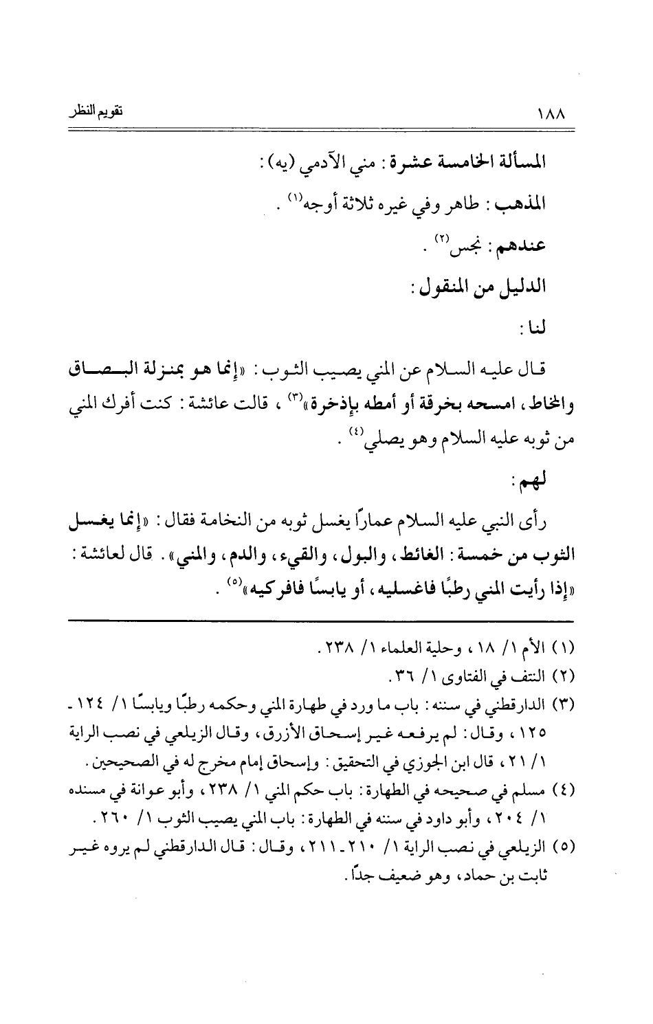 رأى النَّبِي عَلَيْهِ السَّلَام عمارا يغسل ثَوْبه من النخامة فَقَالَ: " إِنَّمَا يغسل الثَّوْب من خَمْسَة: الْغَائِط، وَالْبَوْل، والقيء، وَالدَّم، والمني ". قَالَ لعَائِشَة: " إِذا رَأَيْت الْمَنِيّ رطبا فاغسليه، أَو يَابسا فافركيه ".