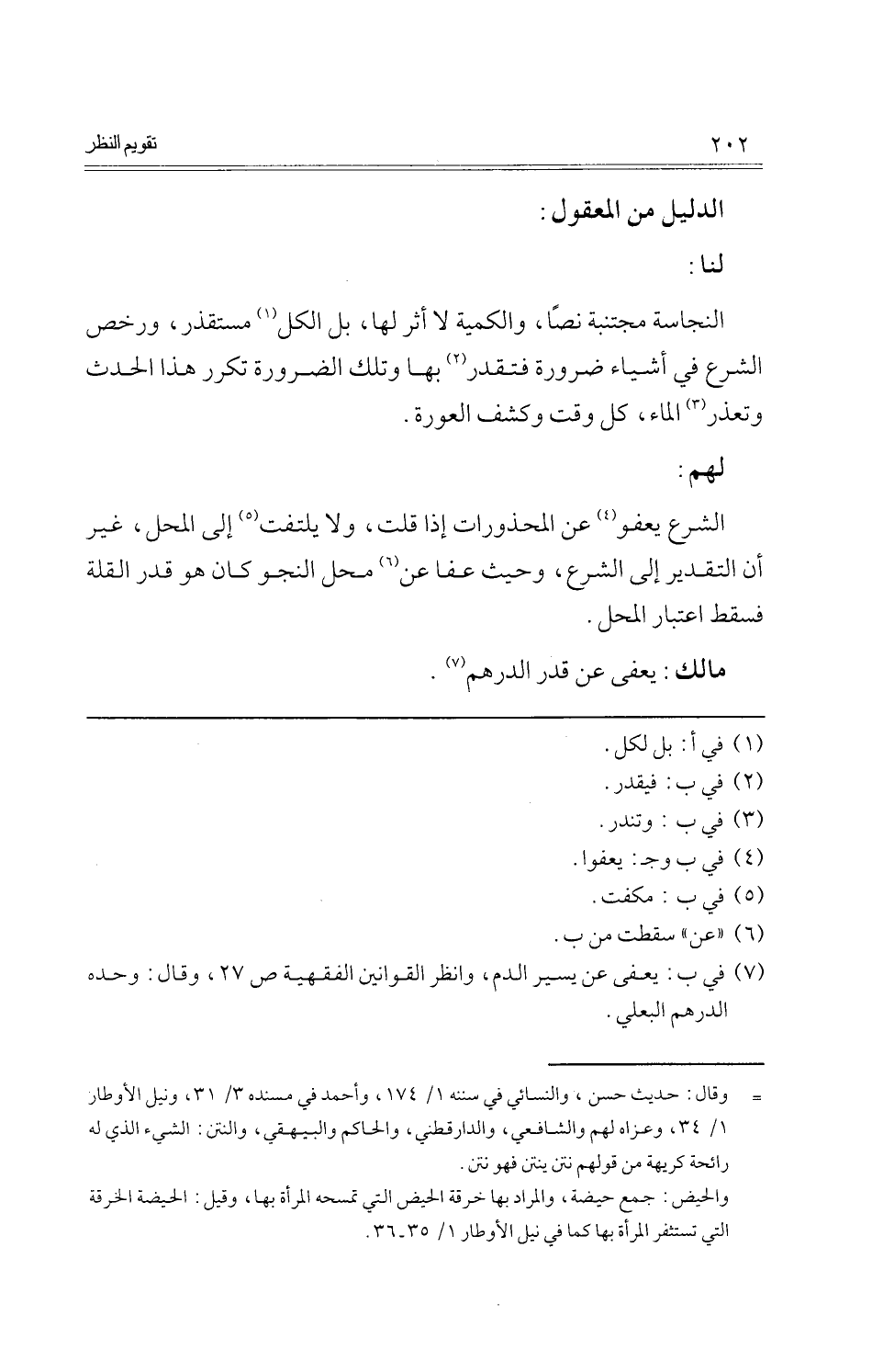 النَّجَاسَة مجتنبة نصا، والكمية لَا أثر لَهَا، بل الْكل مستقذر، وَرخّص الشَّرْع فِي أَشْيَاء ضَرُورَة فتقدر بهَا وَتلك الضَّرُورَة تكَرر هَذَا الْحَدث وَتعذر المَاء، كل وَقت وكشف الْعَوْرَة.
