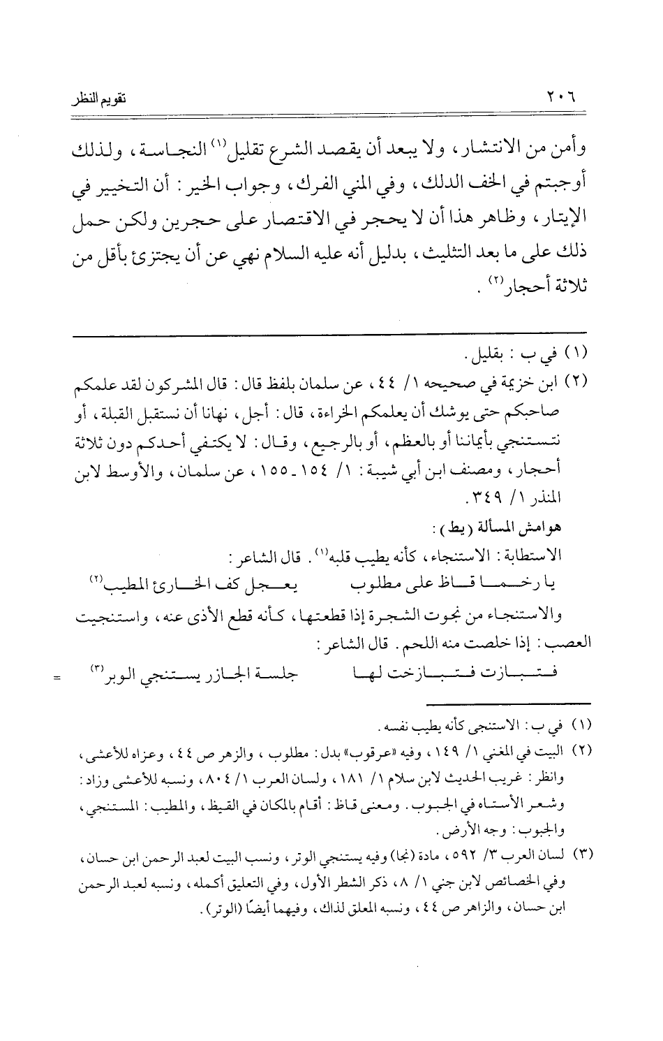 وَأمن من الانتشار، وَلَا يبعد أَن يقْصد الشَّرْع تقليل النَّجَاسَة، وَلذَلِك أوجبتم فِي الْخُف الدَّلْك، وَفِي الْمَنِيّ الفرك، وَجَوَاب الْخَيْر: أَن التَّخْيِير فِي الإيتار، وَظَاهر هَذَا أَن لَا يحْجر فِي الِاقْتِصَار على حجرين وَلَكِن حمل ذَلِك على مَا بعد التَّثْلِيث، بِدَلِيل أَنه عَلَيْهِ السَّلَام نهي عَن أَن يجتزئ بِأَقَلّ من ثَلَاثَة أَحْجَار.