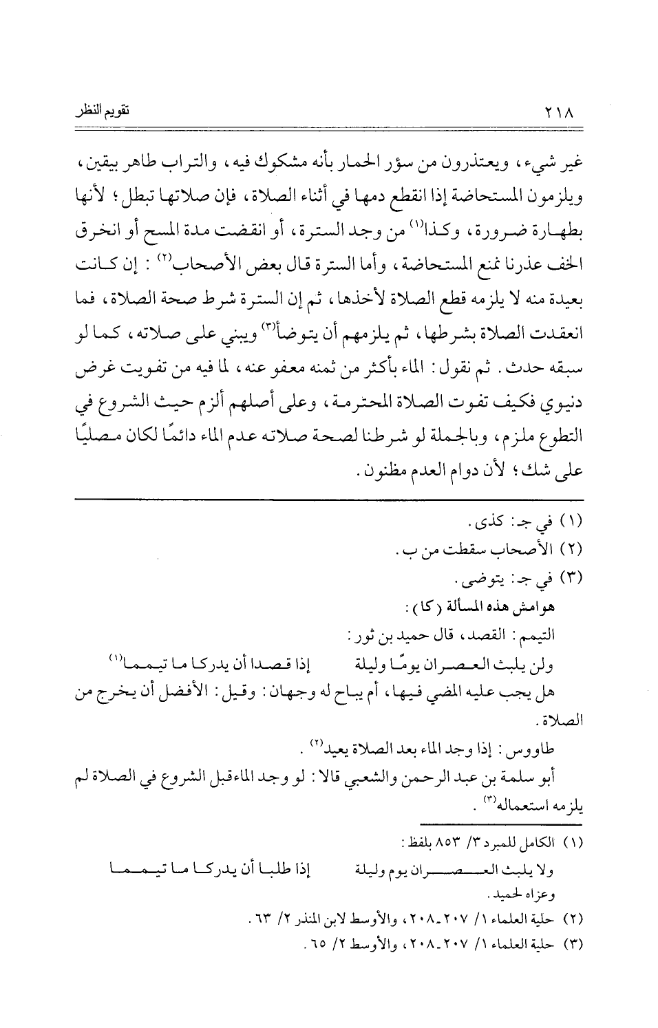 غير شَيْء، ويعتذرون من سُؤْر الْحمار بِأَنَّهُ مَشْكُوك فِيهِ، وَالتُّرَاب طَاهِر بِيَقِين، ويلزمون الْمُسْتَحَاضَة إِذا انْقَطع دَمهَا فِي أثْنَاء الصَّلَاة، فَإِن صلَاتهَا تبطل؛ لِأَنَّهَا بِطَهَارَة ضَرُورَة، وَكَذَا من وجد الستْرَة، أَو انْقَضتْ مُدَّة الْمسْح أَو انخرق الْخُف عذرنا نمْنَع الْمُسْتَحَاضَة، وَأما الستْرَة قَالَ بعض الْأَصْحَاب: إِن كَانَت بعيدَة مِنْهُ لَا يلْزمه قطع الصَّلَاة لأخذها، ثمَّ إِن الستْرَة شَرط صِحَة الصَّلَاة، فَمَا انْعَقَدت الصَّلَاة بشرطها، ثمَّ يلْزمهُم أَن يتَوَضَّأ وَيَبْنِي على صلَاته، كَمَا لَو سبقه حدث. ثمَّ نقُول: المَاء بِأَكْثَرَ من ثمنه مَعْفُو عَنهُ، لما فِيهِ من تَفْوِيت غَرَض دُنْيَوِيّ فَكيف تفوت الصَّلَاة المحترمة، وعَلى أصلهم ألزم حَيْثُ الشُّرُوع فِي التَّطَوُّع مُلْزم، وَبِالْجُمْلَةِ لَو شرطنا لصِحَّة صلَاته عدم المَاء دَائِما لَكَانَ مُصَليا على شكّ؛ لِأَن دوَام الْعَدَم مظنون.