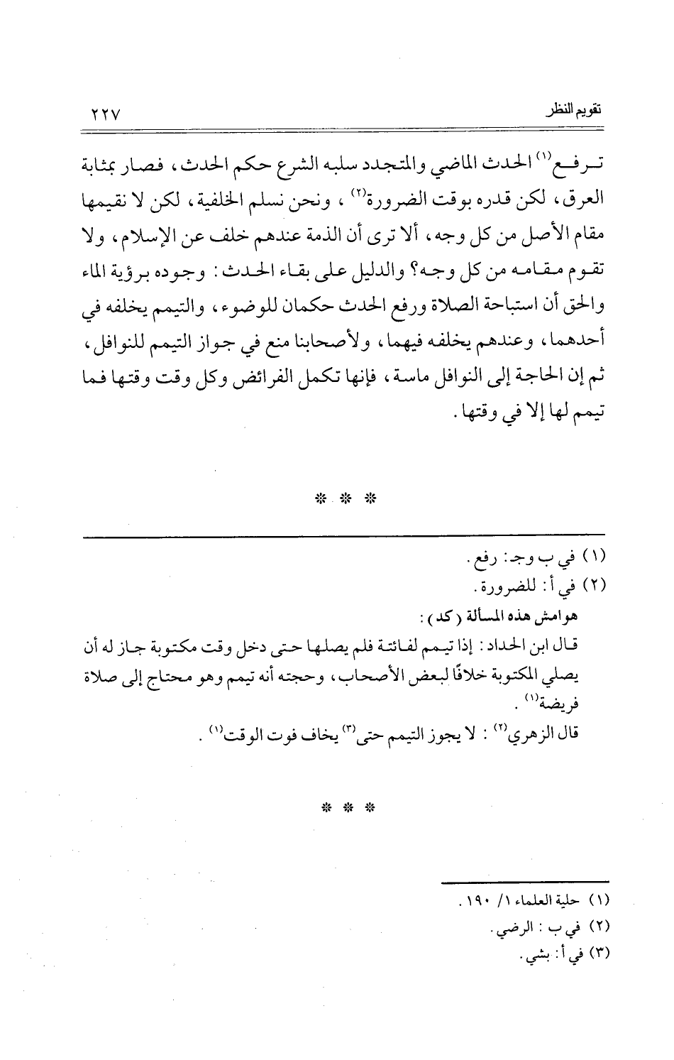 ترفع الْحَدث الْمَاضِي والمتجدد سلبه الشَّرْع حكم الْحَدث، فَصَارَ بِمَثَابَة الْعرق، لَكِن قدره بِوَقْت الضَّرُورَة، وَنحن نسلم الخلفية، لَكِن لَا نقيمها مقَام الأَصْل من كل وَجه، أَلا ترى أَن الذِّمَّة عِنْدهم خلف عَن الْإِسْلَام، وَلَا تقوم مقَامه من كل وَجه؟ وَالدَّلِيل على بَقَاء الْحَدث: وجوده بِرُؤْيَة المَاء وَالْحق أَن اسْتِبَاحَة الصَّلَاة وَرفع الْحَدث حكمان للْوُضُوء، وَالتَّيَمُّم يخلفه فِي أَحدهمَا: وَعِنْدهم يخلفه فيهمَا، ولأصحابنا منع فِي جَوَاز التَّيَمُّم للنوافل، ثمَّ إِن الْحَاجة إِلَى النَّوَافِل ماسة، فَإِنَّهَا تكمل الْفَرَائِض وكل وَقت وَقتهَا فَمَا تيَمّم لَهَا إِلَّا فِي وَقتهَا.