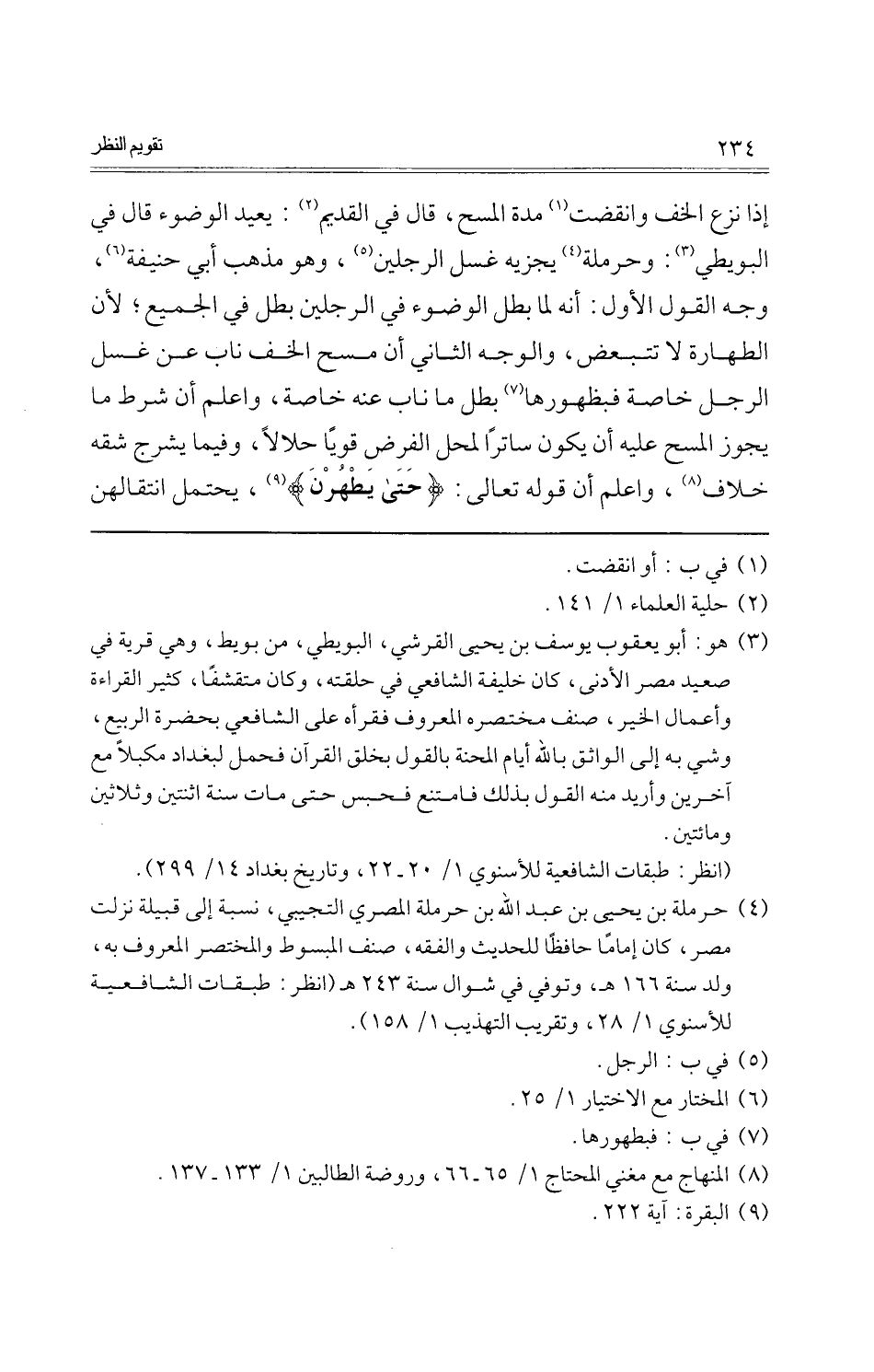 إِذا نزع الْخُف وَانْقَضَت مُدَّة الْمسْح، قَالَ فِي الْقَدِيم: يُعِيد الْوضُوء قَالَ فِي الْبُوَيْطِيّ: وحرملة يجْزِيه غسل الرجلَيْن، وَهُوَ مَذْهَب أبي حنيفَة، وَجه القَوْل الأول: أَنه لما بَطل الْوضُوء فِي الرجلَيْن بَطل فِي الْجَمِيع؛ لِأَن الطَّهَارَة لَا تتبعض، وَالْوَجْه الثَّانِي أَن مسح الْخُف نَاب عَن غسل الرجل خَاصَّة فبظهورها بَطل مَا نَاب عَنهُ خَاصَّة، وَاعْلَم أَن شَرط مَا يجوز الْمسْح عَلَيْهِ أَن يكون ساترا لمحل الْفَرْض قَوِيا حَلَالا، وَفِيمَا يشرج شقَّه خلاف، وَاعْلَم أَن قَوْله تَعَالَى: {حَتَّى يطهرن} ، يحْتَمل انتقالهن