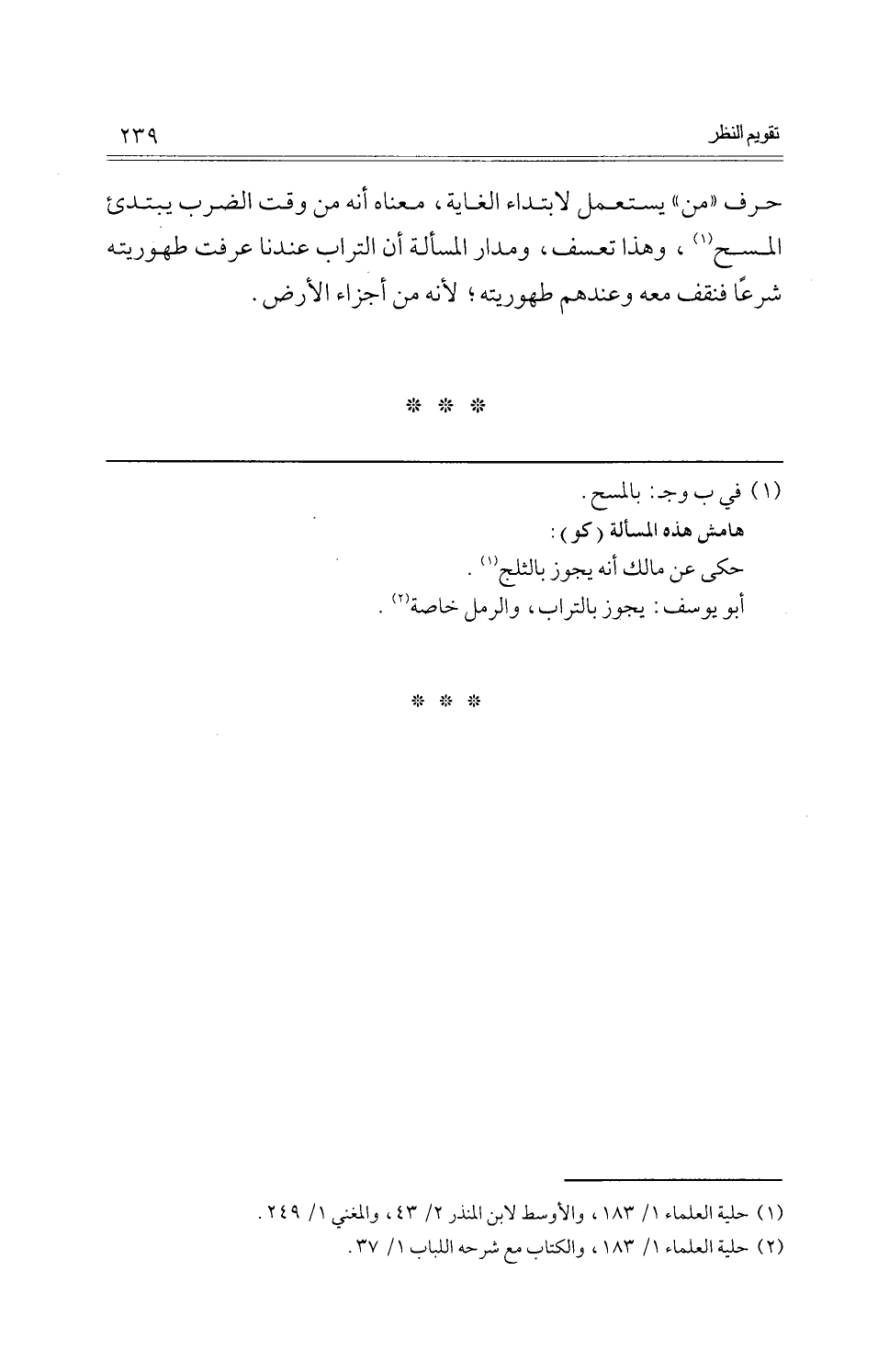 حرف " من " يسْتَعْمل لابتداء الْغَايَة، مَعْنَاهُ أَنه من وَقت الضَّرْب يَبْتَدِئ الْمسْح، وَهَذَا تعسف، ومدار الْمَسْأَلَة أَن التُّرَاب عندنَا عرفت طهوريته شرعا فنقف مَعَه وَعِنْدهم طهوريته؛ لِأَنَّهُ من أَجزَاء الأَرْض.