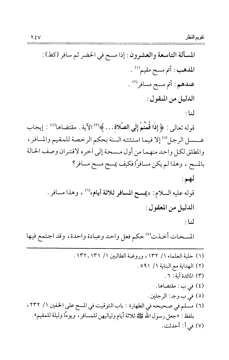 قَوْله تَعَالَى: {إِذا قُمْتُم إِلَى الصَّلَاة} الْآيَة. مقتضاها: إِيجَاب غسل الرجل إِلَّا فِيمَا استثنته السّنة بِحكم الرُّخْصَة للمقيم وَالْمُسَافر، وَالْمُطلق لكل وَاحِد مِنْهُمَا من أول مسحة إِلَى آخِره لاقتران وصف الْحَالة بِالْمَسْحِ، وَهَذَا لم يكن مُسَافِرًا فَكيف يمسح مسح مُسَافر؟