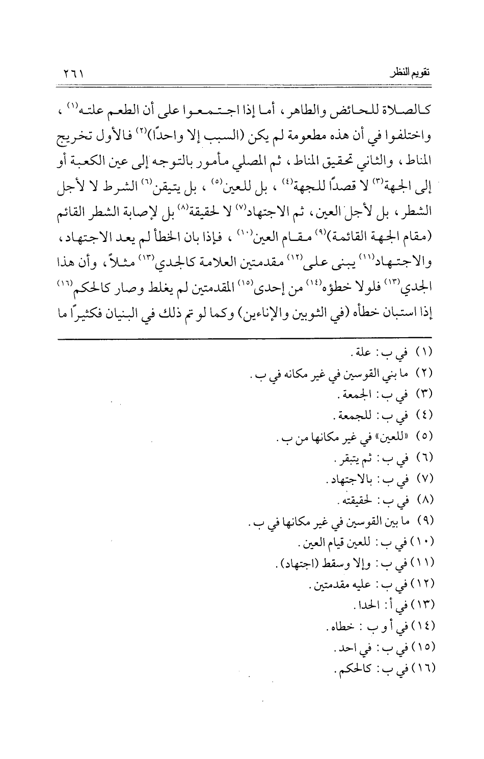 كَالصَّلَاةِ للحائض والطاهر، أما إِذا اجْتَمعُوا على أَن الطّعْم علته، وَاخْتلفُوا فِي أَن هَذِه مطعومة لم يكن (السَّبَب إِلَّا وَاحِدًا) فَالْأول تَخْرِيج المناط، وَالثَّانِي تَحْقِيق المناط، ثمَّ الْمُصَلِّي مَأْمُور بالتوجه إِلَى عين الْكَعْبَة أَو إِلَى الْجِهَة لَا قصدا للجهة، بل للعين، بل يتَيَقَّن الشَّرْط لَا لأجل الشّطْر، بل لأجل الْعين، ثمَّ الِاجْتِهَاد لَا لحقيقة بل لإصابة الشّطْر الْقَائِم (مقَام الْجِهَة الْقَائِمَة) مقَام الْعين، فَإِذا بَان الْخَطَأ لم يعد الِاجْتِهَاد، وَالِاجْتِهَاد يبْنى على مقدمتين الْعَلامَة كالجدي مثلا، وَأَن هَذَا الجدي فلولا خَطؤُهُ من إِحْدَى المقدمتين لم يلغط وَصَارَ كَالْحكمِ إِذا استبان خطأه (فِي الثَّوْبَيْنِ والإناءين) وكما لَو تمّ ذَلِك فِي الْبُنيان فكثيرا مَا