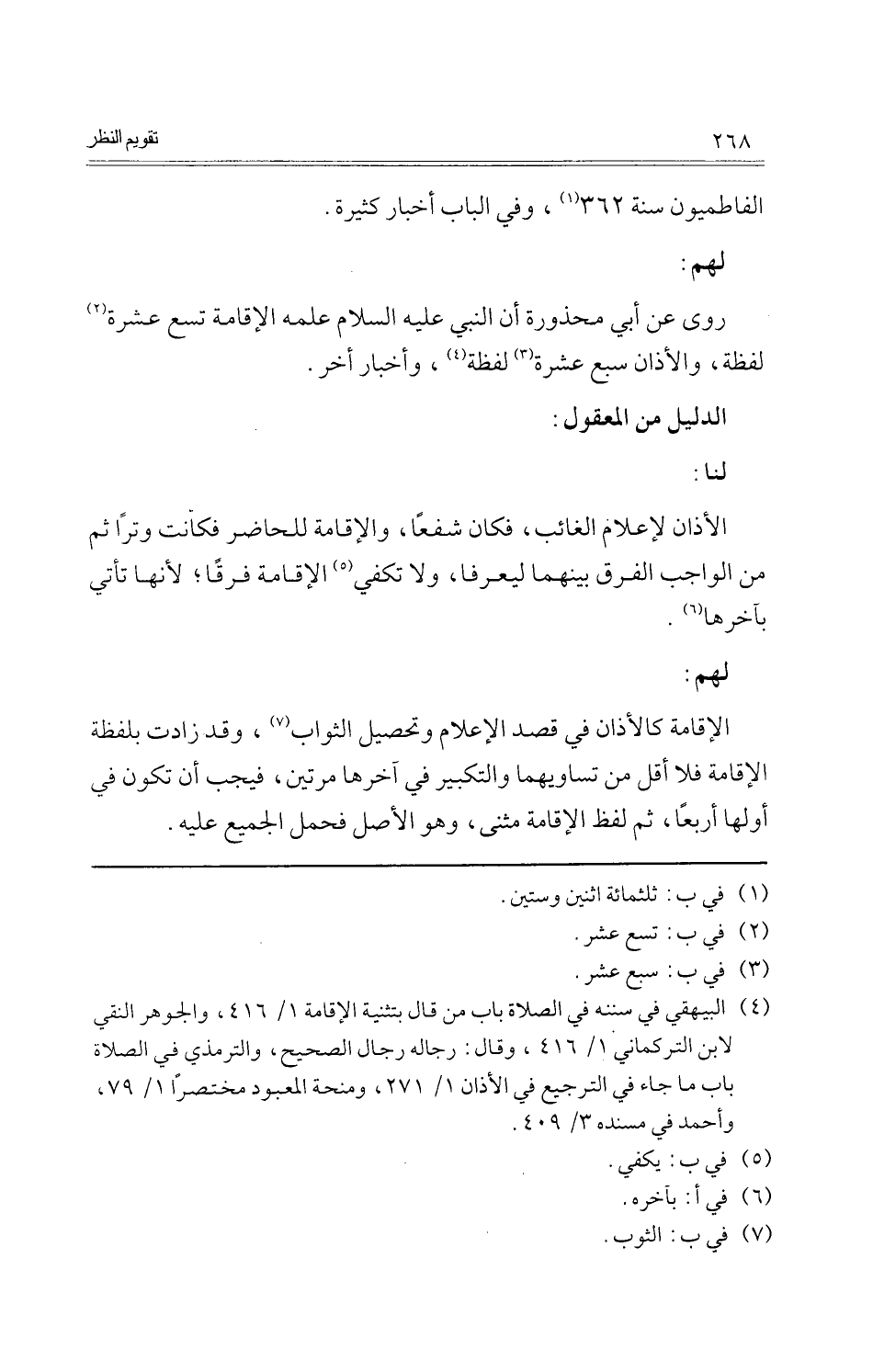 روى عَن أبي مَحْذُورَة أَن النَّبِي عَلَيْهِ السَّلَام علمه الْإِقَامَة تسع عشرَة لَفْظَة، وَالْأَذَان سبع عشرَة لَفْظَة، وأخبار أخر.