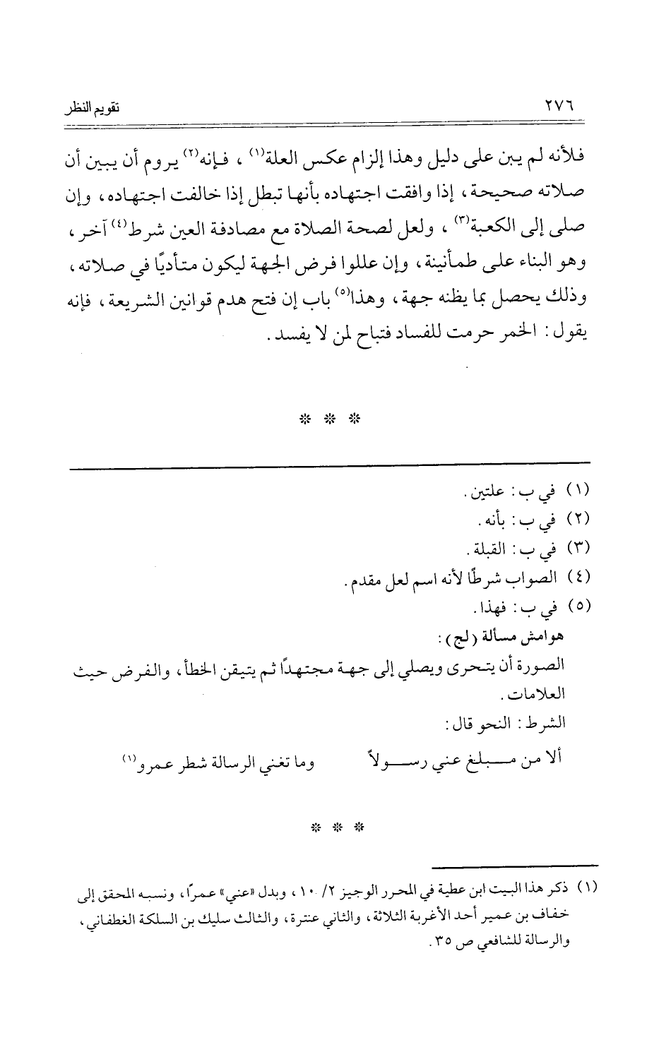 فَلِأَنَّهُ لم يبن على دَلِيل وَهَذَا إِلْزَام عكس الْعلَّة، فَإِنَّهُ يروم أَن يبين أَن صلَاته صَحِيحَة، إِذا وَافَقت اجْتِهَاده بِأَنَّهَا تبطل إِذا خَالَفت اجْتِهَاده، وَإِن صلى إِلَى الْكَعْبَة، وَلَعَلَّ لصِحَّة الصَّلَاة مَعَ مصادفة الْعين شَرط آخر، وَهُوَ الْبناء على طمأنينة، وَإِن عللوا فرض الْجِهَة ليَكُون متأديا فِي صلَاته، وَذَلِكَ يحصل بِمَا يَظُنّهُ جِهَة، وَهَذَا بَاب إِن فتح هدم قوانين الشَّرِيعَة، فَإِنَّهُ يَقُول: الْخمر حرمت للْفَسَاد فتباح لمن لَا يفْسد.