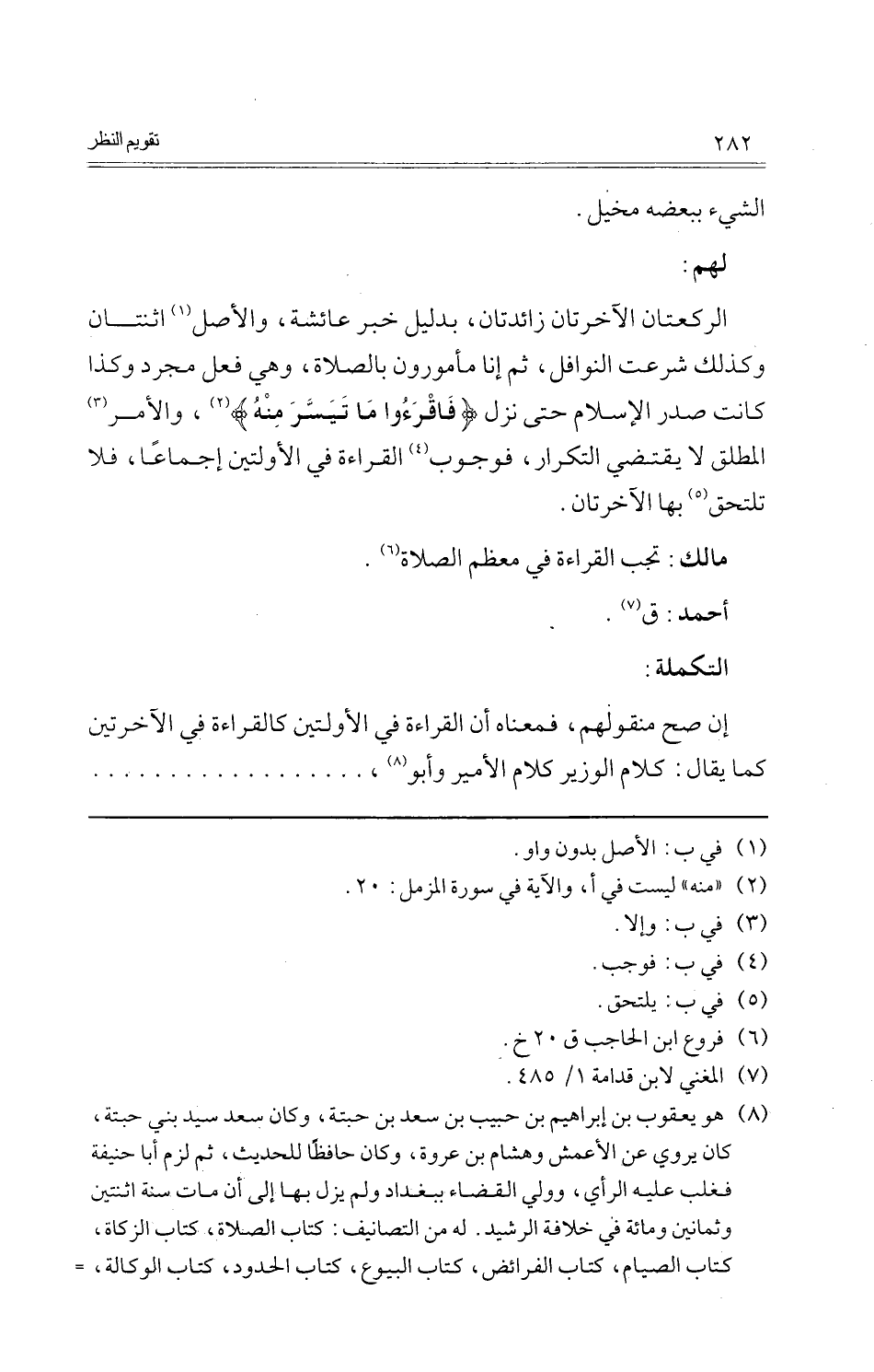 الركعتان الآخرتان زائدتان، بِدَلِيل خبر عَائِشَة، وَالْأَصْل اثْنَتَانِ وَكَذَلِكَ شرعت النَّوَافِل، ثمَّ إِنَّا مأمورون بِالصَّلَاةِ، وَهِي فعل مُجَرّد وَكَذَا كَانَت صدر الْإِسْلَام حَتَّى نزل {فاقرءوا مَا تيَسّر مِنْهُ} ، وَالْأَمر الْمُطلق لَا يَقْتَضِي التّكْرَار، فوجوب الْقِرَاءَة فِي الأولتين إِجْمَاعًا، فَلَا تلتحق بهَا الآخرتان.