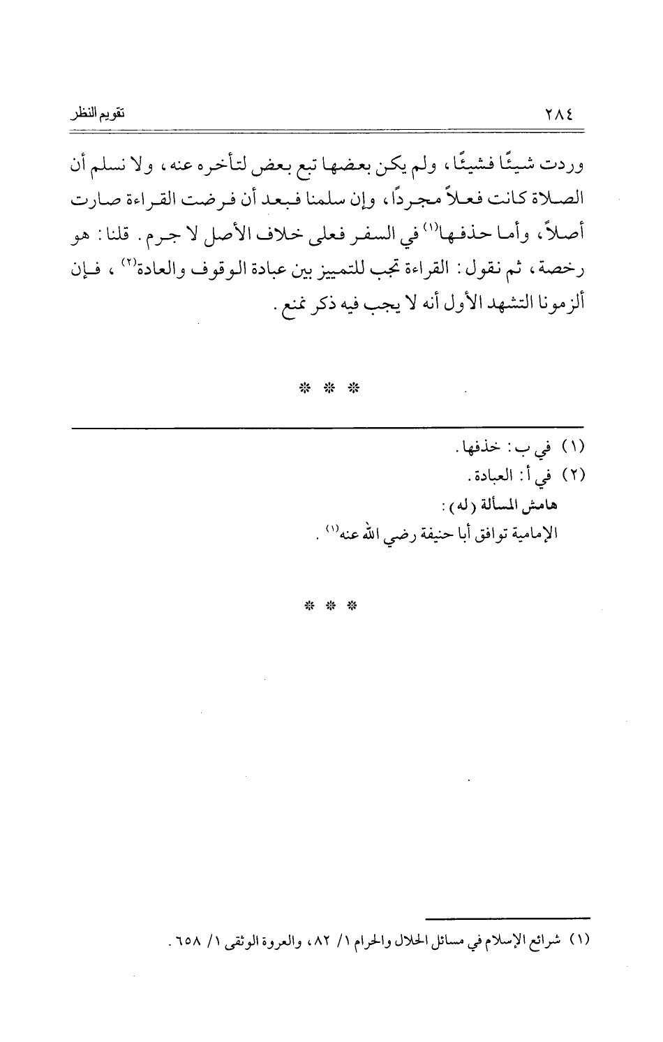 وَردت شَيْئا فَشَيْئًا، وَلم يكن بَعْضهَا تبع بعض لتأخره عَنهُ، وَلَا نسلم أَن الصَّلَاة كَانَت فعلا مُجَردا، وَإِن سلمنَا فَبعد أَن فرضت الْقِرَاءَة صَارَت أصلا، وَأما حذفهَا فِي السّفر فعلى خلاف الأَصْل لَا جرم. قُلْنَا: هُوَ رخصَة، ثمَّ نقُول: الْقِرَاءَة تجب للتمييز بَين عبَادَة الْوُقُوف وَالْعَادَة، فَإِن ألزمونا التَّشَهُّد الأول أَنه لَا يجب فِيهِ ذكر نمْنَع.