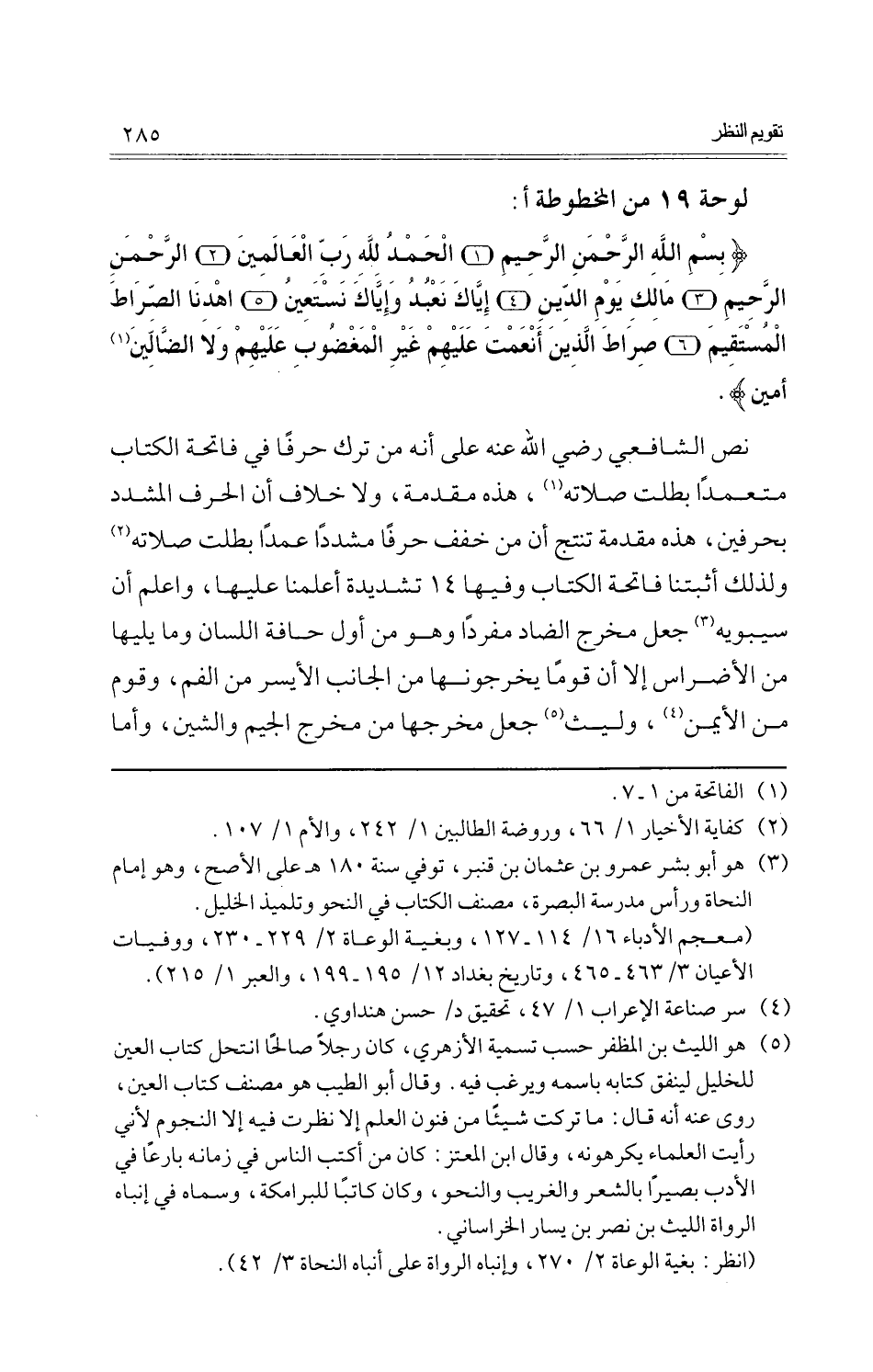 نَص الشَّافِعِي رَضِي الله عَنهُ على أَنه من ترك حرفا فِي فَاتِحَة الْكتاب مُتَعَمدا بطلت صلَاته، هَذِه مُقَدّمَة، وَلَا خلاف أَن الْحَرْف المشدد بحرفين، هَذِه مُقَدّمَة تنْتج أَن من خفف حرفا مشددا عمدا بطلت صلَاته وَلذَلِك أثبتنا فَاتِحَة الْكتاب وفيهَا 14 تشديدة أعلمنَا عَلَيْهَا، وَاعْلَم أَن سِيبَوَيْهٍ جعل مخرج الضَّاد مُفردا وَهُوَ من أول حافة اللِّسَان وَمَا يَليهَا من الأضراس إِلَّا أَن قوما يخرجونها من الْجَانِب الْأَيْسَر من الْفَم، وَقوم من الْأَيْمن، وَلَيْث جعل مخرجها من مخرج الْجِيم والشين، وَأما