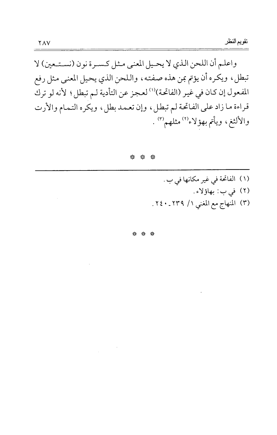وَاعْلَم أَن اللّحن الَّذِي لَا يحِيل الْمَعْنى مثل كسرة نون (نستعين) لَا تبطل، وَيكرهُ أَن يؤتم بِمن هَذِه صفته، واللحن الَّذِي يحِيل الْمَعْنى مثل رفع الْمَفْعُول إِن كَانَ فِي غير (الْفَاتِحَة) لعجز عَن التأدية لم تبطل؛ لِأَنَّهُ لَو ترك قِرَاءَة مَا زَاد على الْفَاتِحَة لم تبطل، وَإِن تعمد بَطل، وَيكرهُ التَّمام والأرت والألثغ، ويأتم بهؤلاء مثلهم.