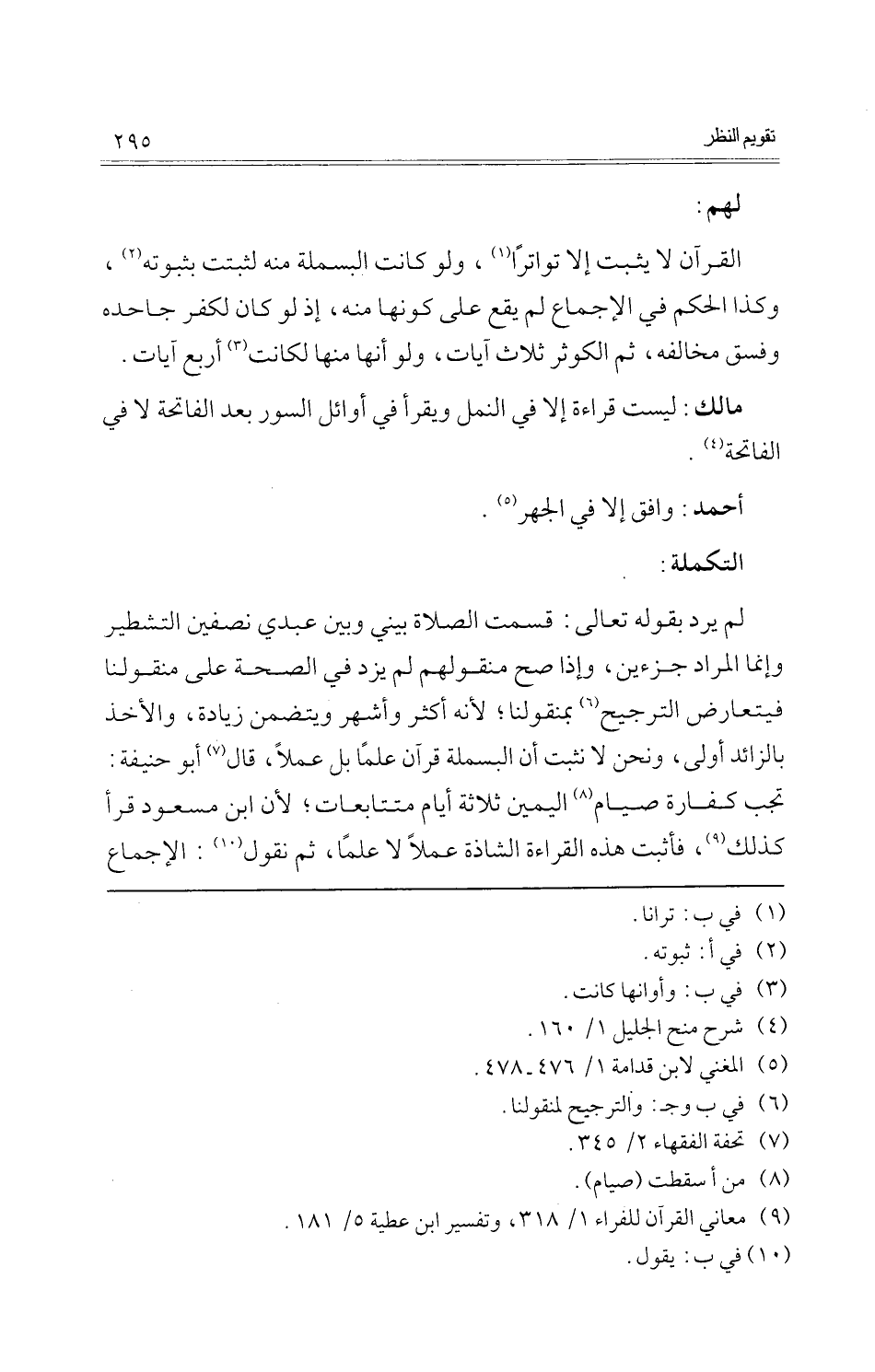 لم يرد بقوله تَعَالَى: قسمت الصَّلَاة بيني وَبَين عَبدِي نِصْفَيْنِ التشطير وَإِنَّمَا المُرَاد جزءين، وَإِذا صَحَّ منقولهم لم يزدْ فِي الصِّحَّة على منقولنا فيتعارض التَّرْجِيح بمنقولنا؛ لِأَنَّهُ أَكثر وَأشهر ويتضمن زِيَادَة، وَالْأَخْذ بِالزَّائِدِ أولى، وَنحن لَا نثبت أَن الْبَسْمَلَة قُرْآن علما بل عملا، قَالَ أَبُو حنيفَة: تجب كَفَّارَة صِيَام الْيَمين ثَلَاثَة أَيَّام مُتَتَابِعَات؛ لِأَن ابْن مَسْعُود قَرَأَ كَذَلِك، فَأثْبت هَذِه الْقِرَاءَة الشاذة عملا لَا علما، ثمَّ نقُول: الْإِجْمَاع