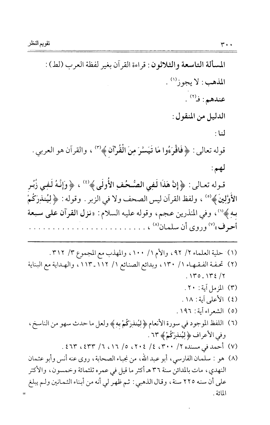 قَوْله تَعَالَى: {إِن هَذَا لفي الصُّحُف الأولى} ، {وَإنَّهُ لفي زبر الْأَوَّلين} ، وَلَفظ الْقُرْآن لَيْسَ الصُّحُف وَلَا فِي الزبر. وَقَوله: {لينذركم بِهِ} ، وَفِي الْمُنْذرين عجم، وَقَوله عَلَيْهِ السَّلَام: " نزل الْقُرْآن على سَبْعَة أحرف " وروى أَن سلمَان، ... ... ... ... ... ... ... ... ... ... ... ... ...