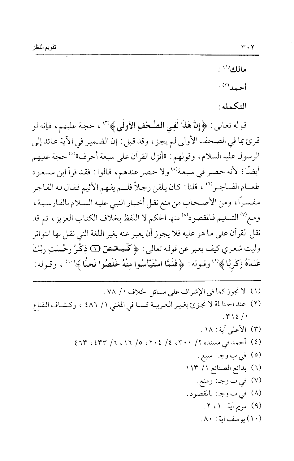 قَوْله تَعَالَى: {إِن هَذَا لفي الصُّحُف الأولى} ، حجَّة عَلَيْهِم، فَإِنَّهُ لَو قرئَ بِمَا فِي الصُّحُف الأولى لم يجز، وَقد قيل: إِن الضَّمِير فِي الْآيَة عَائِد إِلَى الرَّسُول عَلَيْهِ السَّلَام، وَقَوْلهمْ: " أنزل الْقُرْآن على سَبْعَة أحرف " حجَّة عَلَيْهِم أَيْضا؛ لِأَنَّهُ حصر فِي سَبْعَة وَلَا حصر عِنْدهم، قَالُوا: فقد قَرَأَ ابْن مَسْعُود طَعَام الْفَاجِر، قُلْنَا: كَانَ يلقن رجلا فَلم يفهم الأثيم فَقَالَ لَهُ الْفَاجِر مُفَسرًا، وَمن الْأَصْحَاب من منع نقل أَخْبَار النَّبِي عَلَيْهِ السَّلَام بِالْفَارِسِيَّةِ، وَمَعَ التَّسْلِيم فالمقصود مِنْهَا الحكم لَا اللَّفْظ بِخِلَاف الْكتاب الْعَزِيز، ثمَّ قد نقل الْقُرْآن على مَا هُوَ عَلَيْهِ فَلَا يجوز أَن يعبر عَنهُ بِغَيْر اللُّغَة الَّتِي نقل بهَا التَّوَاتُر وليت شعري كَيفَ يعبر عَن قَوْله تَعَالَى: {كهيعص (1) ذكر رحمت رَبك عَبده زَكَرِيَّا} وَقَوله: {فَلَمَّا استيأسوا مِنْهُ خلصوا نجيا} ، وَقَوله: