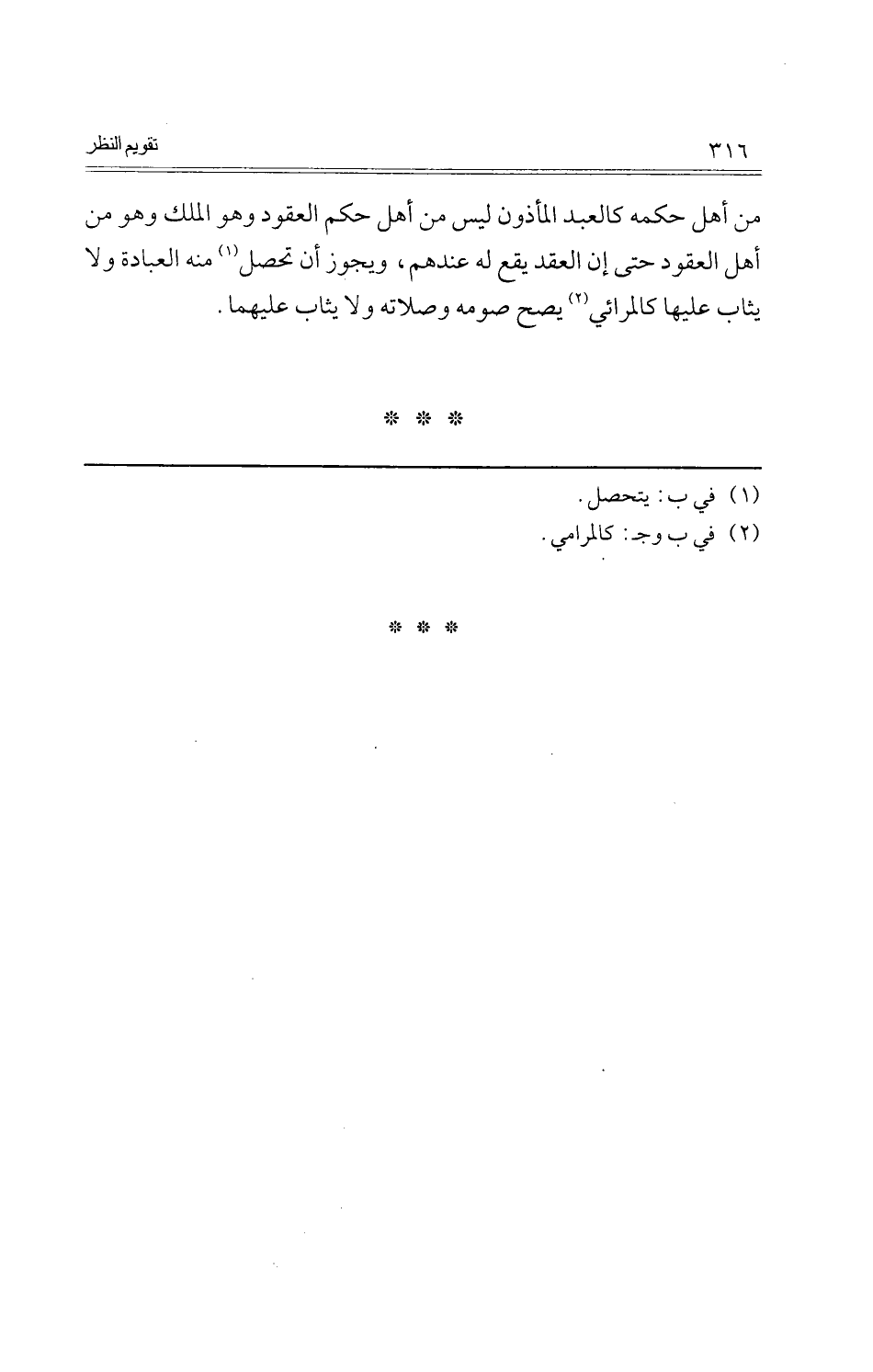 من أهل حكمه كَالْعَبْدِ الْمَأْذُون لَيْسَ من أهل حكم الْعُقُود وَهُوَ الْملك وَهُوَ من أهل الْعُقُود حَتَّى إِن العقد يَقع لَهُ عِنْدهم، وَيجوز أَن تحصل مِنْهُ الْعِبَادَة وَلَا يُثَاب عَلَيْهَا كالمرائي يَصح صَوْمه وَصلَاته وَلَا يُثَاب عَلَيْهِمَا.