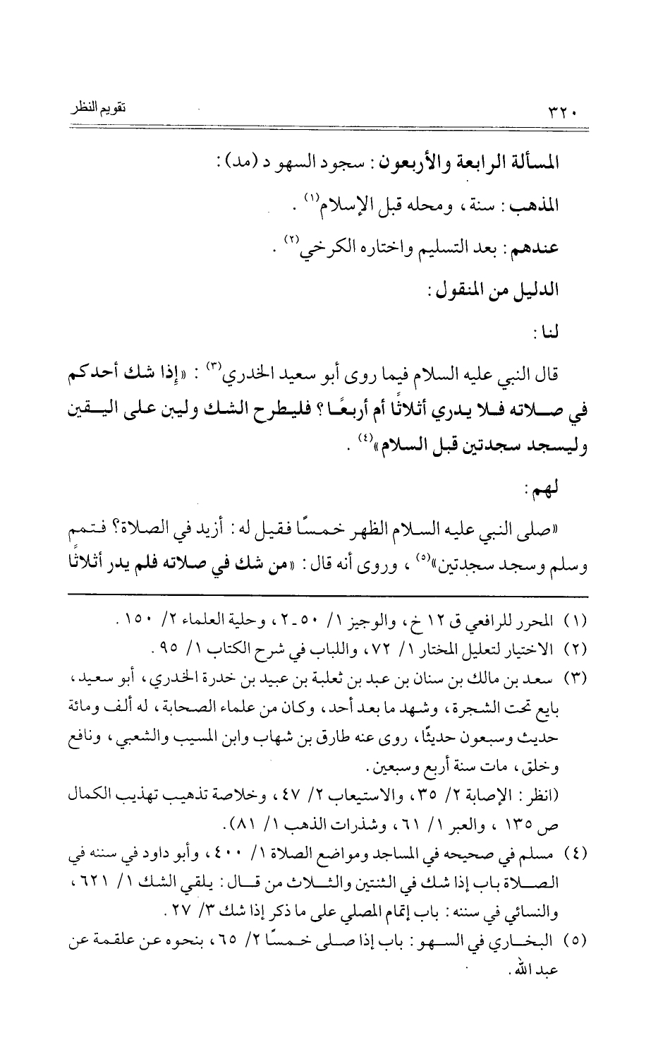 قَالَ النَّبِي عَلَيْهِ السَّلَام فِيمَا روى أَبُو سعيد الْخُدْرِيّ: " إِذا شكّ أحدكُم فِي صلَاته فَلَا يدْرِي أَثلَاثًا أم أَرْبعا؟ فليطرح الشَّك وليبن على الْيَقِين وليسجد سَجْدَتَيْنِ قبل السَّلَام ".
