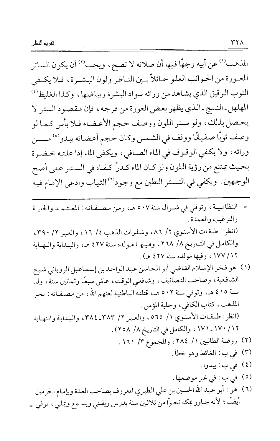 الْمَذْهَب عَن أَبِيه وَجها فِيهَا أَن صلَاته لَا تصح، وَيجب أَن يكون السَّاتِر للعورة من الجوانب الْعُلُوّ حَائِلا بَين النَّاظر ولون الْبشرَة، فَلَا يَكْفِي الثَّوْب الرَّقِيق الَّذِي يُشَاهد من وَرَائه سَواد الْبشرَة وبياضها، وَكَذَا الغليظ المهلهل - النسج - الَّذِي يظْهر بعض الْعَوْرَة من فرجه، فَإِن مَقْصُود السّتْر لَا يحصل بذلك، وَلَو ستر اللَّوْن وَوصف حجم الْأَعْضَاء فَلَا بَأْس كَمَا لَو وصف ثوبا صفيقا ووقف فِي الشَّمْس وَكَانَ حجم أَعْضَائِهِ يَبْدُو من وَرَائه، وَلَا يَكْفِي الْوُقُوف فِي المَاء الصافي، وَيَكْفِي المَاء إِذا علته خضرَة بِحَيْثُ يمْتَنع من رُؤْيَة اللَّوْن وَلَو كَانَ المَاء كدرا كَفاهُ فِي السّتْر على أصح الْوَجْهَيْنِ. وَيَكْفِي فِي التستر التطين مَعَ وجود الثِّيَاب وَادّعى الإِمَام فِيهِ