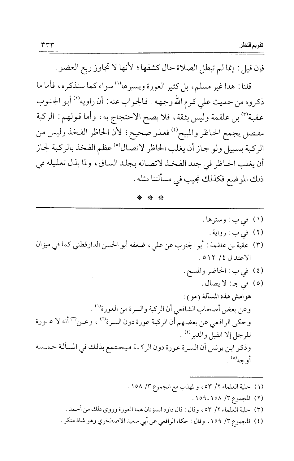 قُلْنَا: هَذَا غير مُسلم، بل كثير الْعَوْرَة ويسيرها سَوَاء كَمَا سَنذكرُهُ، فَأَما مَا ذَكرُوهُ من حَدِيث عَليّ كرم الله وَجهه. فَالْجَوَاب عَنهُ: أَن رِوَايَة أَبُو الْجنُوب عقبَة بن عَلْقَمَة وَلَيْسَ بِثِقَة، فَلَا يَصح الِاحْتِجَاج بِهِ، وَأما قَوْلهم: الرّكْبَة مفصل يجمع الحاظر والمبيح فعذر صَحِيح؛ لِأَن الحاظر الْفَخْذ وَلَيْسَ من الرّكْبَة بسبيل وَلَو جَازَ أَن يغلب الحاظر لاتصال عظم الْفَخْذ بالركبة لجَاز أَن يغلب الحاظر فِي جلد الْفَخْذ لاتصاله بجلد السَّاق، وَلما بذل تَعْلِيله فِي ذَلِك الْموضع فَكَذَلِك نجيب فِي مَسْأَلَتنَا مثله.
