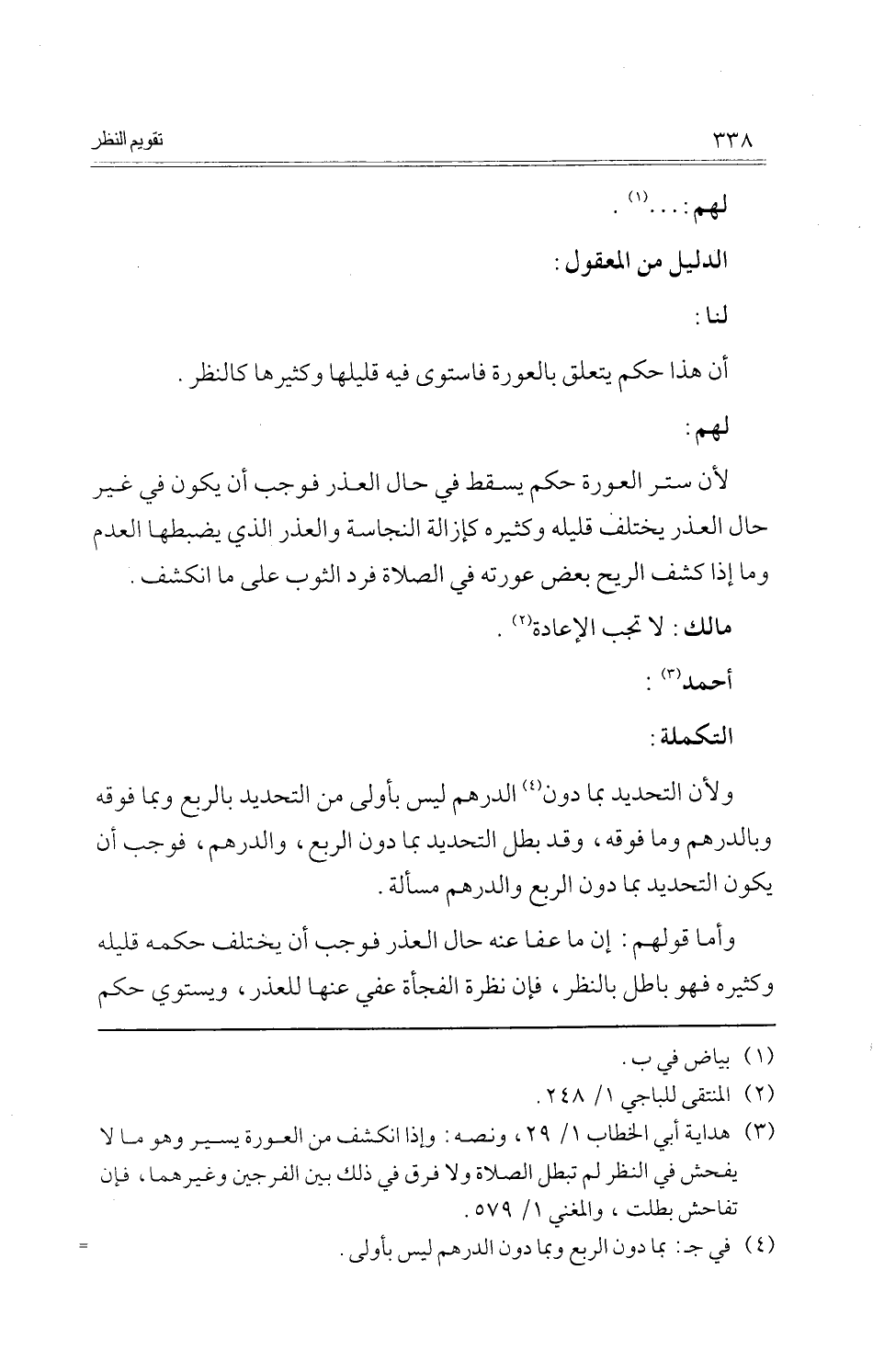 وَأما قَوْلهم: إِن مَا عَفا عَنهُ حَال الْعذر فَوَجَبَ أَن يخْتَلف حكمه قَلِيله وَكَثِيره فَهُوَ بَاطِل بِالنّظرِ، فَإِن نظرة الْفجأَة عُفيَ عَنْهَا للْعُذْر، وَيَسْتَوِي حكم
