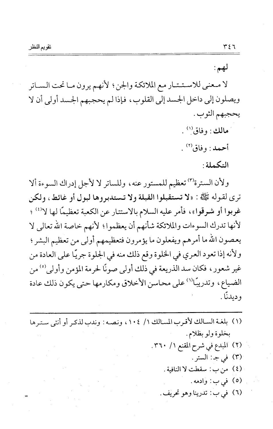 وَلِأَن الستْرَة تَعْظِيم للمستور عَنهُ، وللساتر لَا لأجل إِدْرَاك السوءة أَلا ترى لقَوْله - صَلَّى اللَّهُ عَلَيْهِ وَسَلَّم َ -: " لَا تستقبلوا الْقبْلَة وَلَا تستدبروها لبول أَو غَائِط، وَلَكِن غربوا أَو شرقوا "، فَأمر عَلَيْهِ السَّلَام بالاستتار عَن الْكَعْبَة تَعْظِيمًا لَهَا لَا؛ لِأَنَّهَا تدْرك السوءات وَالْمَلَائِكَة شَأْنهمْ أَن يعظموا؛ لأَنهم خَاصَّة الله تَعَالَى لَا يعصون الله مَا أَمرهم ويفعلون مَا يؤمرون فتعظيمهم أولى من تَعْظِيم الْبشر؛ وَلِأَنَّهُ إِذا تعود العري فِي الْخلْوَة وَقع ذَلِك مِنْهُ فِي الجلوة جَريا على الْعَادة من غير شُعُور، فَكَانَ سد الذريعة فِي ذَلِك أولى صونا لحُرْمَة الْمُؤمن وَأولى من الضّيَاع، وتدريبا على محَاسِن الْأَخْلَاق ومكارمها حَتَّى يكون ذَلِك عَادَة وديدنا.