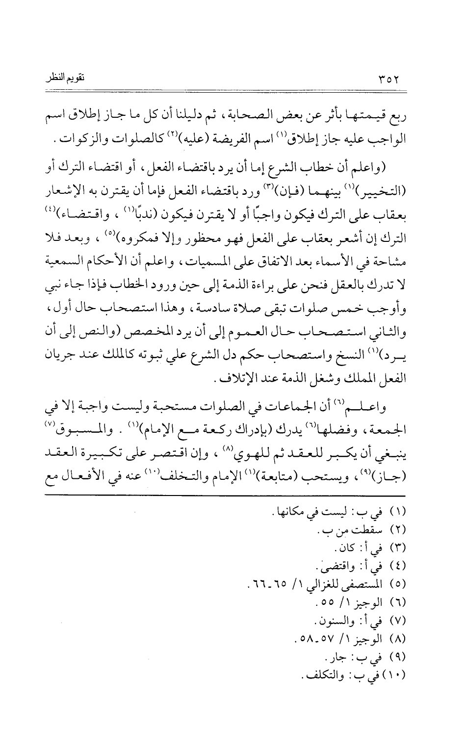 (وَاعْلَم أَن خطاب الشَّرْع إِمَّا أَن يرد باقتضاء الْفِعْل، أَو اقْتِضَاء التّرْك أَو (التَّخْيِير) بَينهمَا (فَإِن) ورد باقتضاء الْفِعْل فإمَّا أَن يقْتَرن بِهِ الْإِشْعَار بعقاب على التّرْك فَيكون وَاجِبا أَو لَا يقْتَرن فَيكون (ندبا، واقتضاء) التّرْك إِن أشعر بعقاب على الْفِعْل فَهُوَ مَحْظُور وَإِلَّا فمكروه) ، وَبعد فَلَا مشاحة فِي الْأَسْمَاء بعد الِاتِّفَاق على المسميات، وَاعْلَم أَن الْأَحْكَام السمعية لَا تدْرك بِالْعقلِ فَنحْن على بَرَاءَة الذِّمَّة إِلَى حِين وُرُود الْخطاب فَإِذا جَاءَ نَبِي وَأوجب خمس صلوَات تبقى صَلَاة سادسة، وَهَذَا اسْتِصْحَاب حَال أول، وَالثَّانِي اسْتِصْحَاب حَال الْعُمُوم إِلَى أَن يرد الْمُخَصّص (وَالنَّص إِلَى أَن يرد) النّسخ واستصحاب حكم دلّ الشَّرْع على ثُبُوته كالملك عِنْد جَرَيَان الْفِعْل المملك وشغل الذِّمَّة عِنْد الْإِتْلَاف.