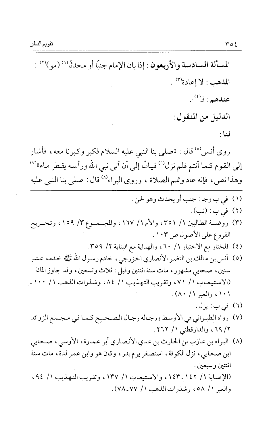 روى أنس قَالَ: " صلى بِنَا النَّبِي عَلَيْهِ السَّلَام فَكبر وَكَبَّرْنَا مَعَه، فَأَشَارَ إِلَى الْقَوْم كَمَا أَنْتُم فَلم نزل قيَاما إِلَى أَن أَتَى نَبِي الله وَرَأسه يقطر مَاء " وَهَذَا نَص، فَإِنَّهُ عَاد وتمم الصَّلَاة، وروى الْبَراء قَالَ: صلى بِنَا النَّبِي عَلَيْهِ