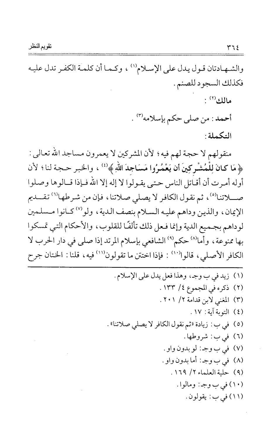 منقولهم لَا حجَّة لَهُم فِيهِ؛ لِأَن الْمُشْركين لَا يعمرون مَسَاجِد الله تَعَالَى: {مَا كَانَ للْمُشْرِكين أَن يعمروا مَسَاجِد الله} ، وَالْخَبَر حجَّة لنا؛ لِأَن أَوله أمرت أَن أقَاتل النَّاس حَتَّى يَقُولُوا لَا إِلَه إِلَّا الله فَإِذا قالوها وصلوا صَلَاتنَا، ثمَّ نقُول الْكَافِر لَا يُصَلِّي صَلَاتنَا، فَإِن من شَرطهَا تَقْدِيم الْإِيمَان، وَالَّذين وداهم عَلَيْهِ السَّلَام بِنصْف الدِّيَة، وَلَو كَانُوا مُسلمين لوداهم بِجَمِيعِ الدِّيَة وَإِنَّمَا فعل ذَلِك تألفا للقلوب، وَالْأَحْكَام الَّتِي تمسكوا بهَا مَمْنُوعَة، وَأما حكم الشَّافِعِي بِإِسْلَام الْمُرْتَد إِذا صلى فِي دَار الْحَرْب لَا الْكَافِر الْأَصْلِيّ، قَالُوا: فَإِذا اختتن مَا تَقولُونَ فِيهِ، قُلْنَا: الْخِتَان جرح