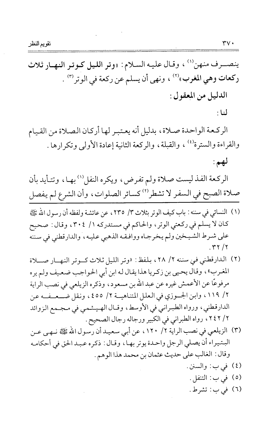 ينْصَرف مِنْهُنَّ، وَقَالَ عَلَيْهِ السَّلَام: " وتر اللَّيْل كوتر النَّهَار ثَلَاث رَكْعَات وَهِي الْمغرب "، وَنهى أَن يسلم عَن رَكْعَة فِي الْوتر.